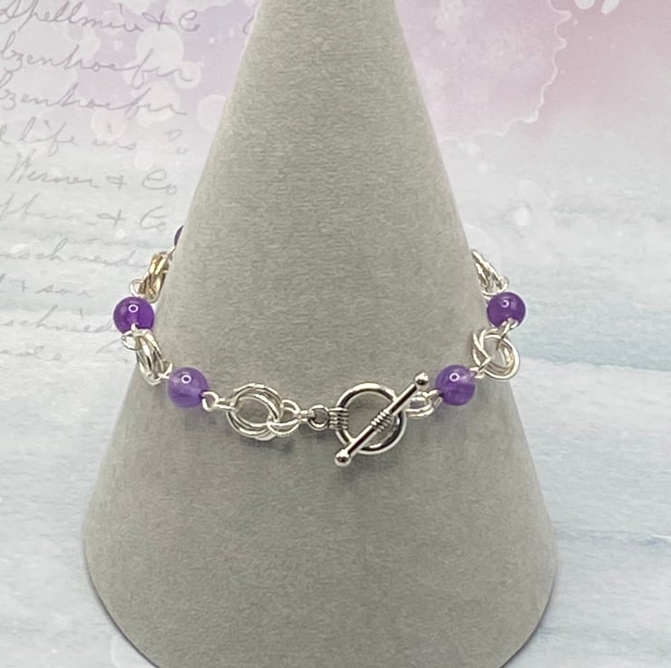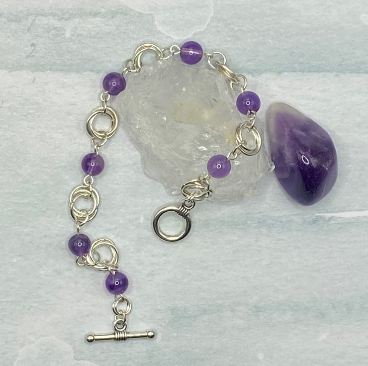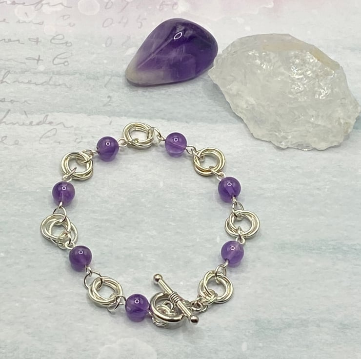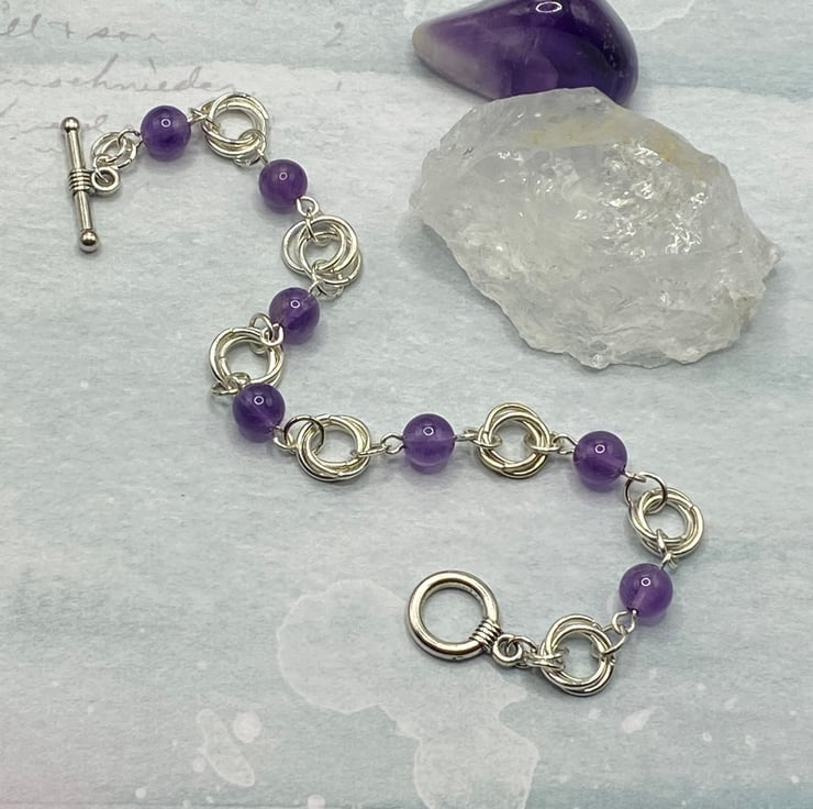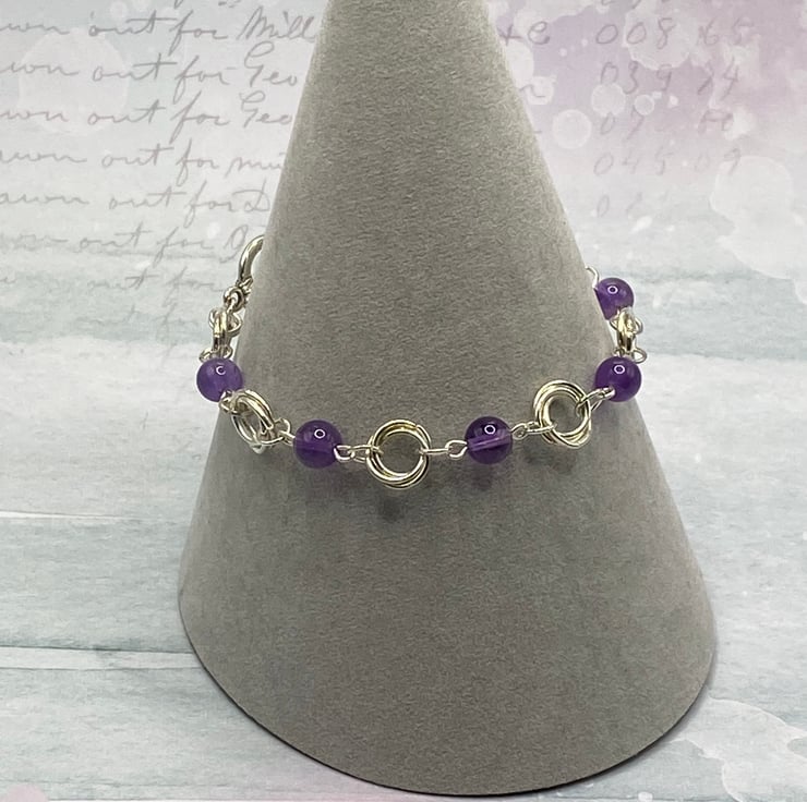 A bracelet of 6mm amethyst rounds, arranged alongside silver plated rings connected together to resemble Mobius rings, finished with a silver plated toggle clasp.