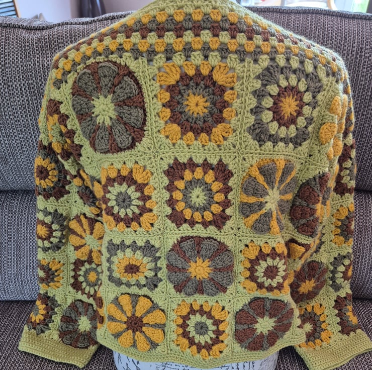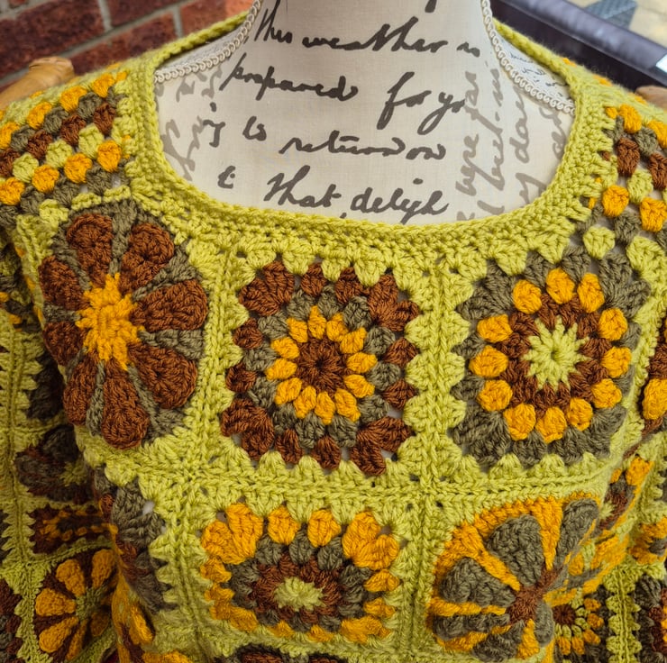 I made this crochet jumper using Sunburst Granny squares and Retro Daisy squares, Made from soft acrylic material, this jumper features long sleeves and a round neckline, making it perfect for casual occasions in the Autumn /Winter season. A comfortable and stylish choice and a striking addition to any wardrobe.