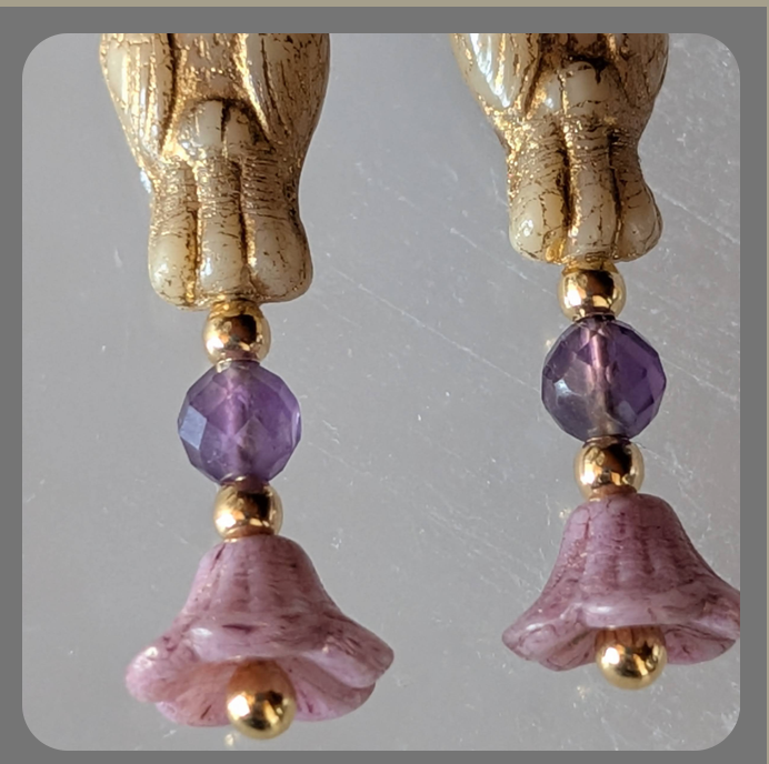 Blodeuwedd inspired Czech Glass Owl Flower, Amethyst and Vermeil (gold plated sterling silver) Earrings.