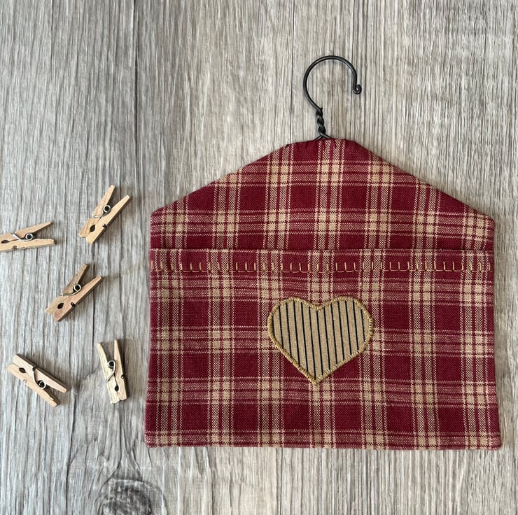 I have designed this mini peg bag, complete with three teeny tiny pegs and an appliqué heart to hang on your wall to pop in bits and bobs such as receipts, car keys, loose change etc. It would make a pretty decoration in a utility room, laundry, kitchen or craft room. The little pegs can also be used to clip little things on to the front.