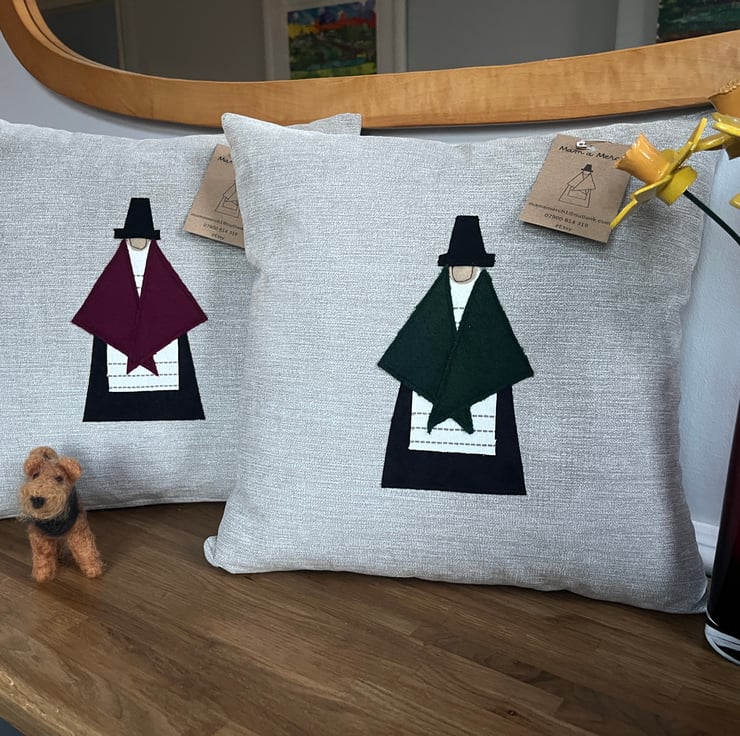 We create beautiful Welsh themed sewn gifts. Our well loved Welsh Lady Cushions bring a touch of tradition in a modern and fresh way. The design was developed into Welsh Lady framed art and then came the tabletop frames. Most of the of the Welsh lady designs are one-offs as it depends on what fabric we have to hand at the time.