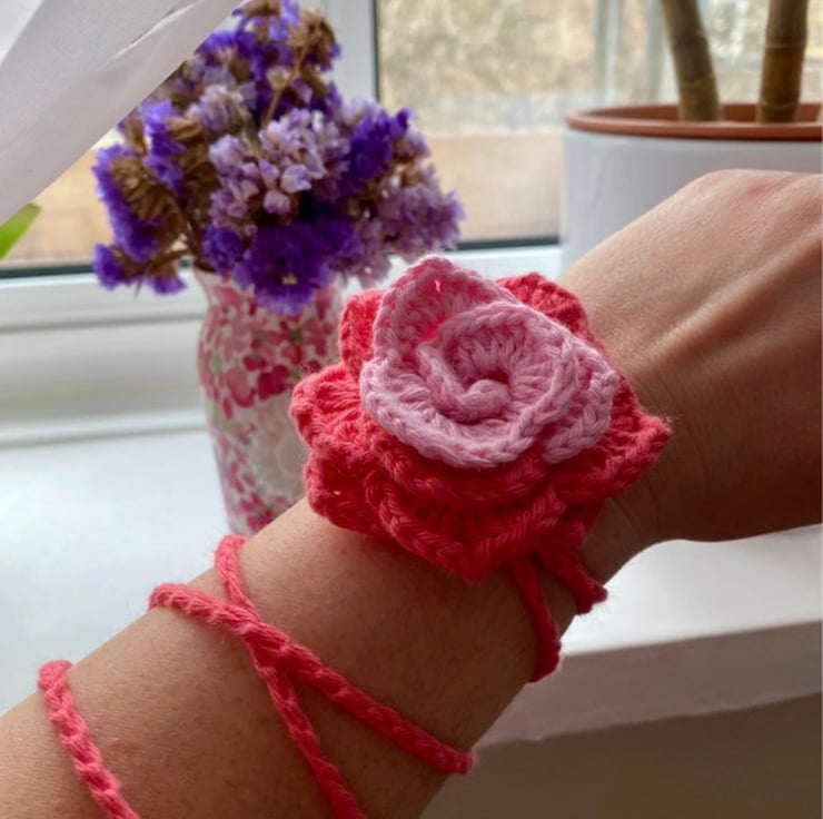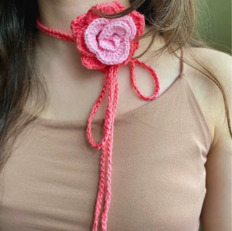 Dark and light pink colour rose flower choker handmade from 100% cotton yarn with red wrap-around cord (cords are approximately 80 cm on each side, rose is 7cm)