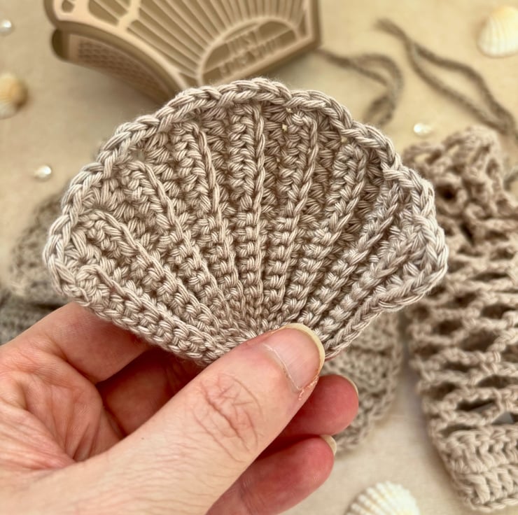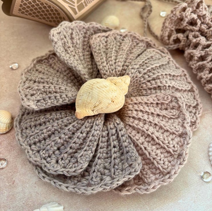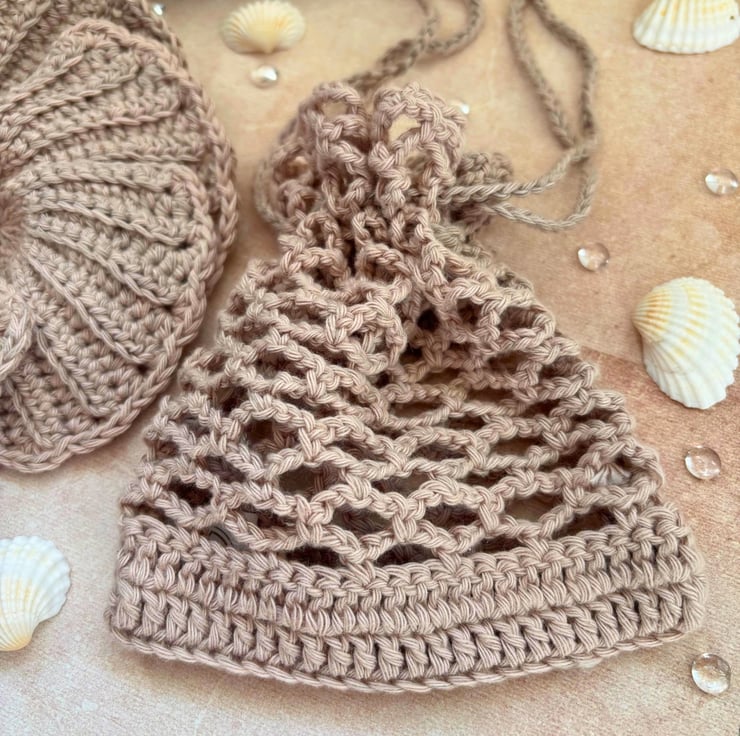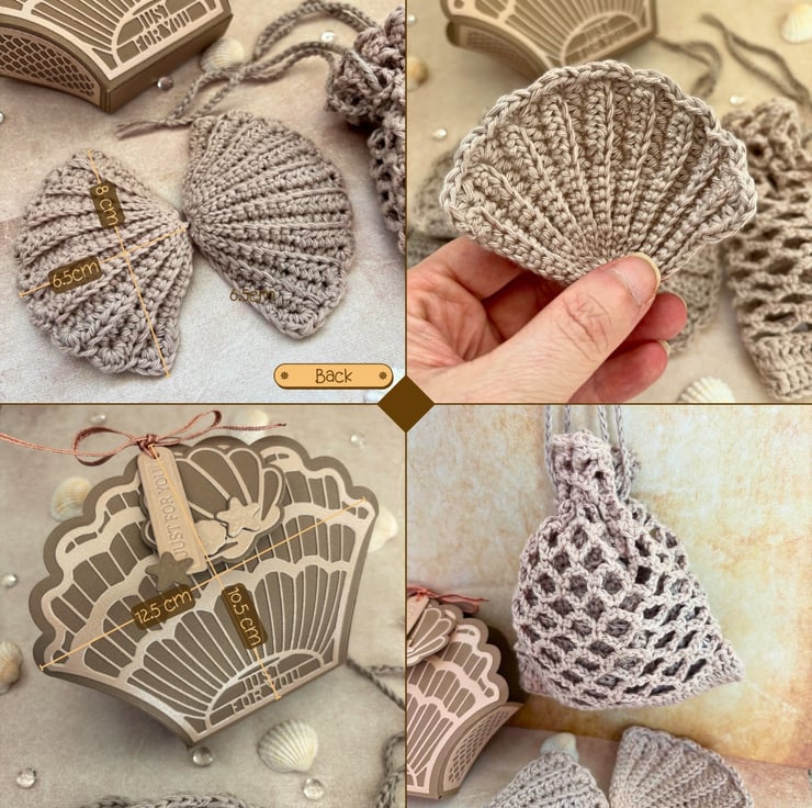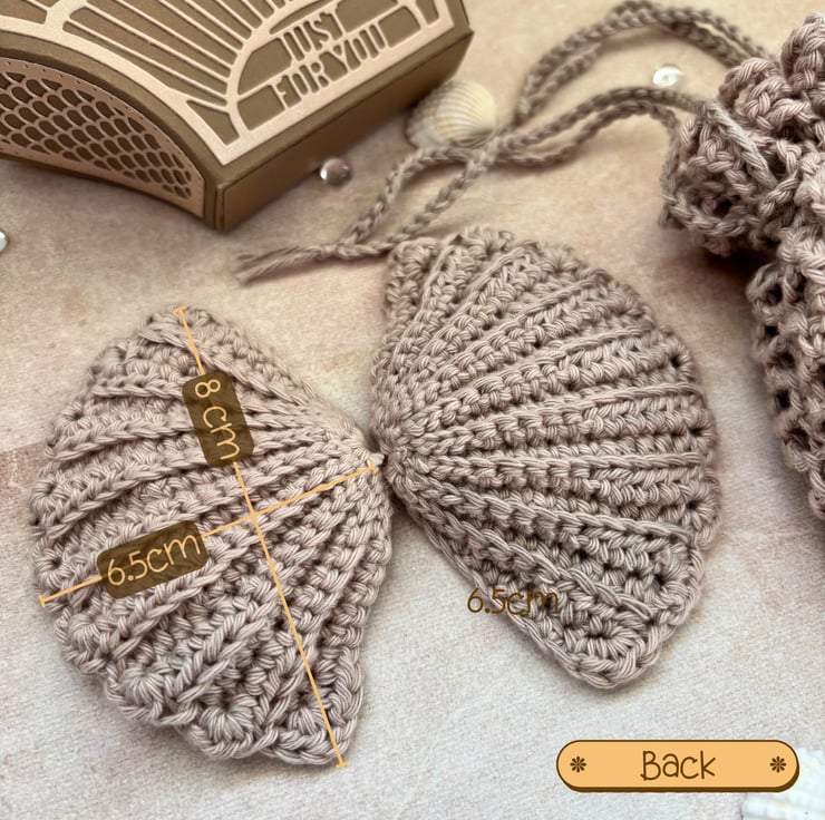 Both the face wipes & the wash bag are hand crocheted with 100% cotton yarn that is self-patterned and changes from light greyish brown to ash grey. The set compromises of 1 wash bag & 7 face wipes. They are in the shape of a seashell and they measure approx. 10x6.5cm (widest points). They can be used with your usual cleanser or water to remove make-up. Rinse them after use, shape & lay them flat to air-dry & reuse them. Wash them regularly in the wash bag, which can also be used to store them. The wash bag measures approx. 13 x 16 cm.