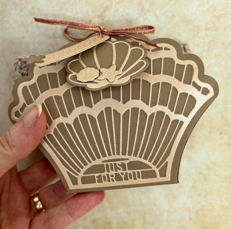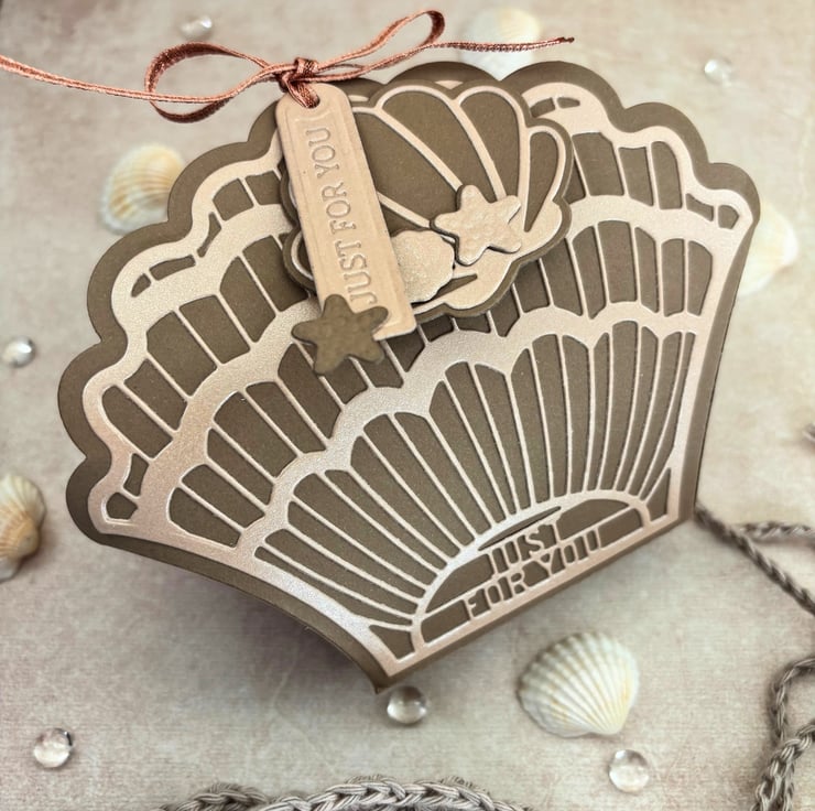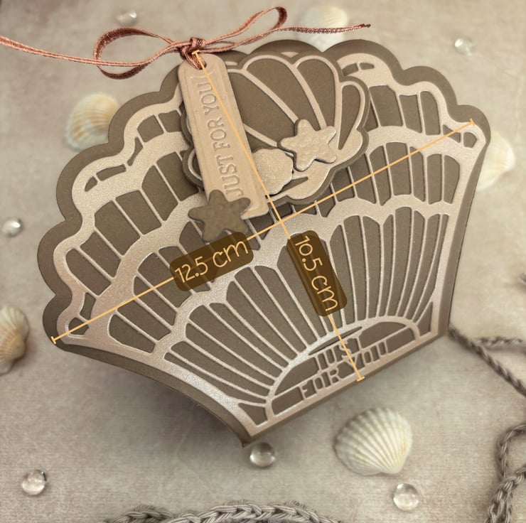 Coordinating handmade seashell gift box in matching colours is available, for a unique, with attention to detail gift presentation. Made of coloured card & pearlescent cardstock, with the sentiment "Just For You" embossed on a swing tag, and die-cut on the front decorative panel. (Extra cost £3.00)