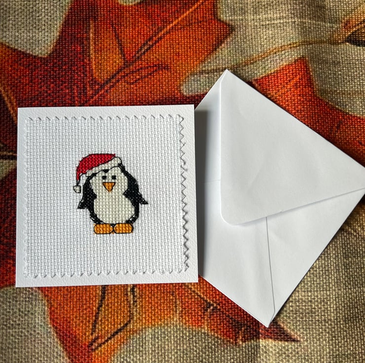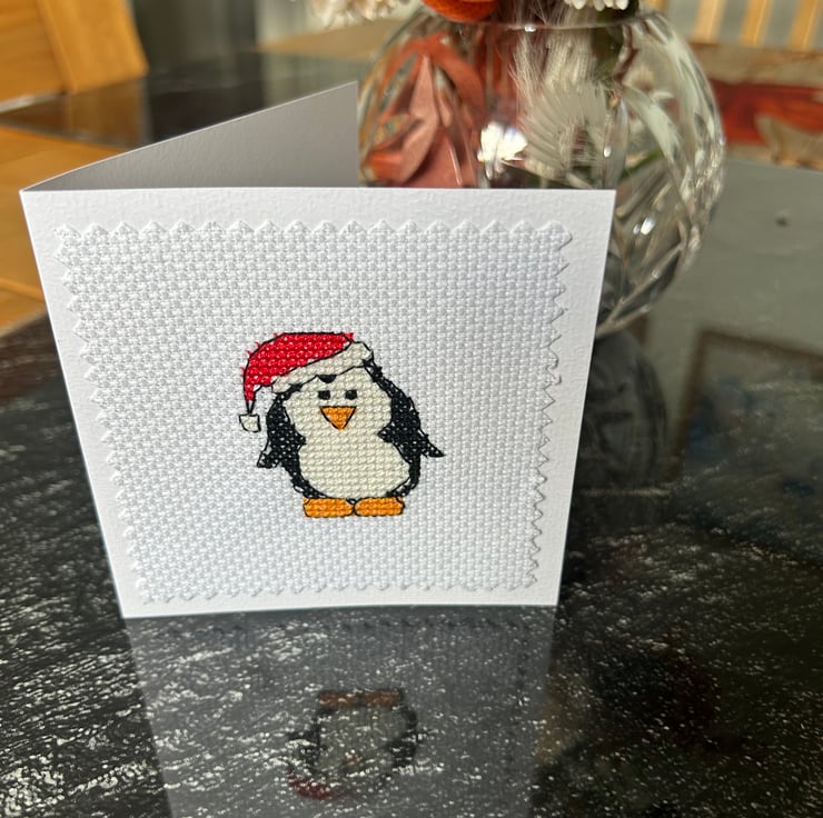 This little cross stitched penguin has got a Christmas hat on. Perfect cute little card. Blank inside for your own message. Cross stitched on white Aida and stuck onto a white card, supplied with an envelope.