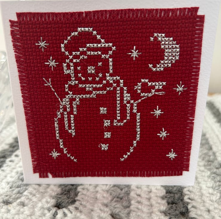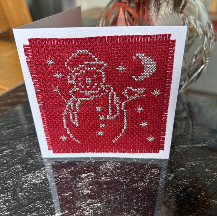Perfect Christmas card. Red Aida on white card, with an outline of a cross stitched snowman, cross stitched in metallic silver thread. Blank inside for your own message.