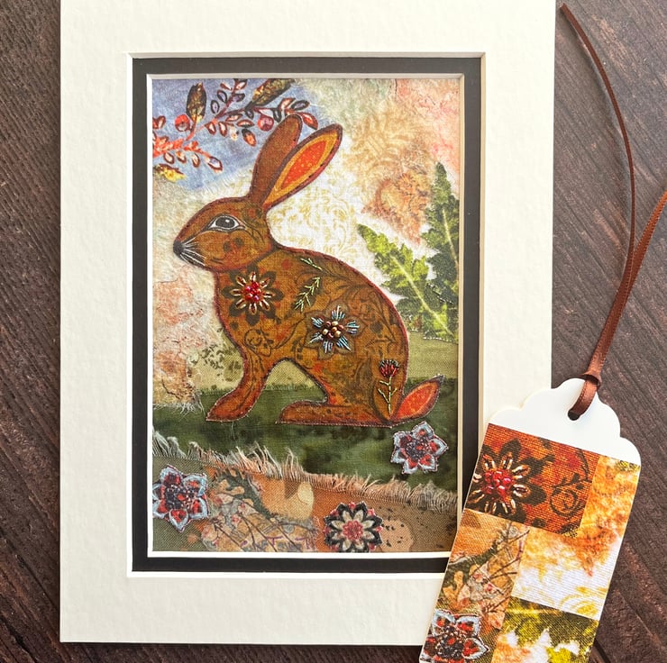 The textured background was created by layering a selection of fabrics and decoupage papers in soft, muted colours. The rabbit has been adorned with flowers and ferns, printed onto fabric and given a wash with inks and acrylic paints. I've added metallic embroidery threads and seed beads to some of the decorations on his back which adds a lovely bit of sparkle. The same flowers and ferns have been cut out and added to the background.