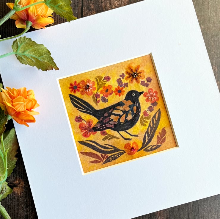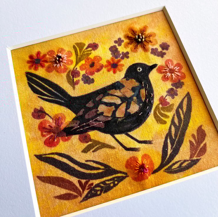 Brighten up a wall or shelf with this small textile picture featuring a folk bird surrounded by flowers.