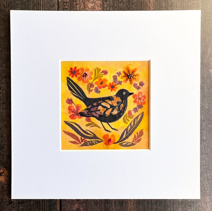 My background is in Graphic Design and although I'm now retired I still enjoy the creative process. A lot of my work features birds and flowers and I particularly love combining different materials and patterns to create colourful, one-of-a-kind mixed media pieces.