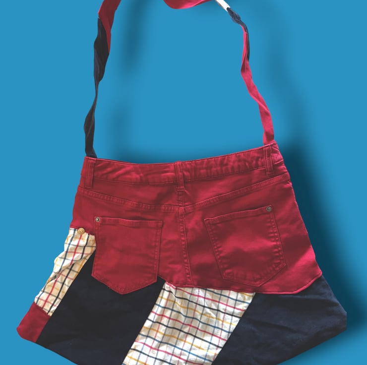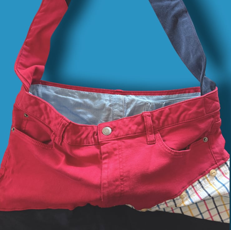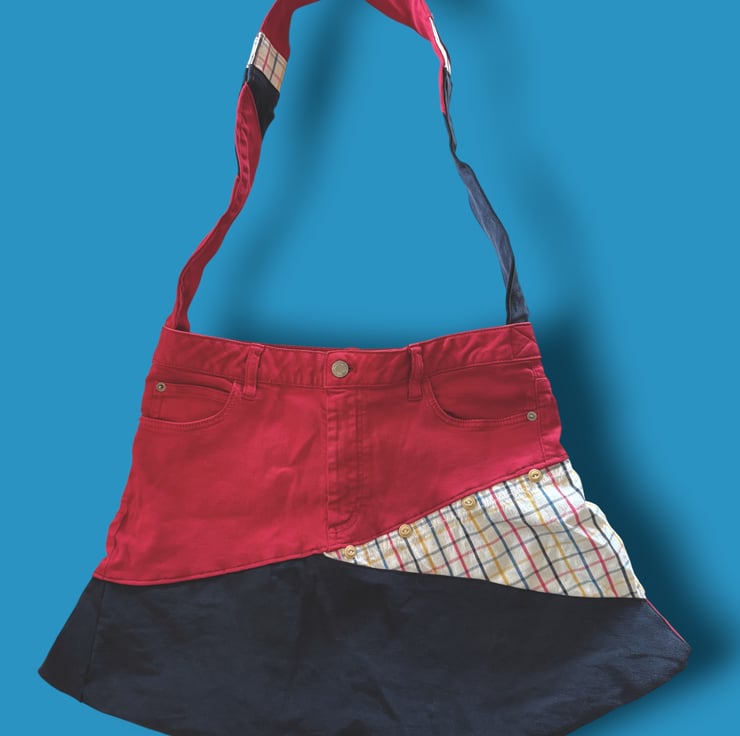 This bag came together from a bright pair of red jeans and a cheerful check shirt that were far too good to waste. Combined with deep navy denim, they’ve found a new life as a bold, happy bag that celebrates colour, creativity and conscious making. Upcycling never looked so good!