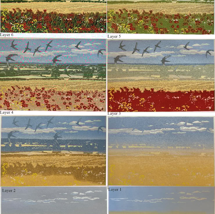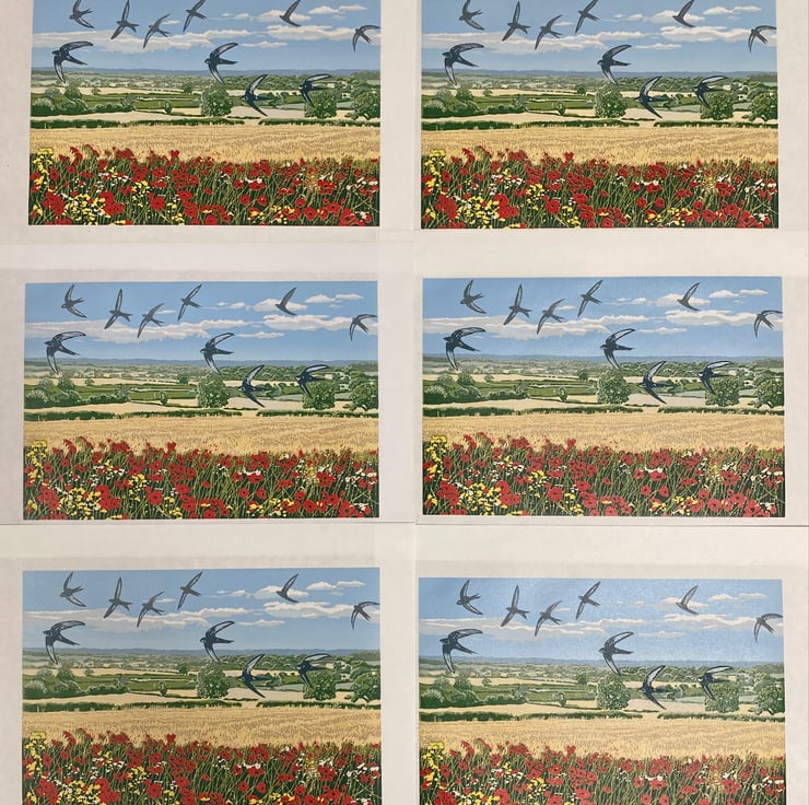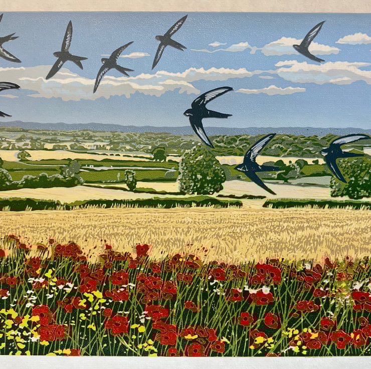 Summer Swifts - Original handmade 8 layer, 15 colour reduction lino print of 10 flying swifts with a wildflower hedgerow with poppies and the view from the edge of the Yorkshire Moors across to The Dales from Upsall near Thirsk. Not a digital print but a completely Handmade and hand printed individual piece of original artwork on Hoshu Japanese printmakers paper made with quality Cranfield Caligo Safewash water based inks using a Sizzix Big Shot Pro craft printing press. Each of the 9 colour layers has been printed from the same block over a period of around 2 months as each layer dries and the block is carefully cut away and the next colour is printed. From a limited series of 30 prints each is individually hand made and has differing variations in tone and each is a unique piece of art.