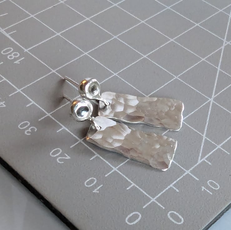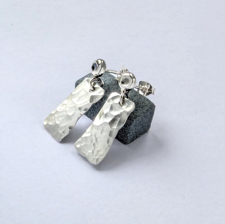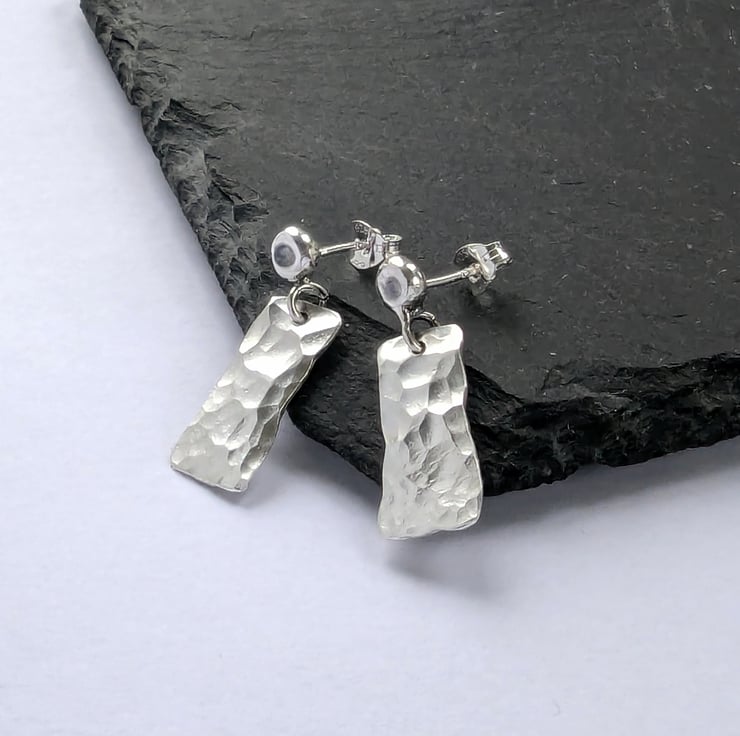 Hammered dimple textured mis shaped rectangles dropping from small oxidised concave stud .