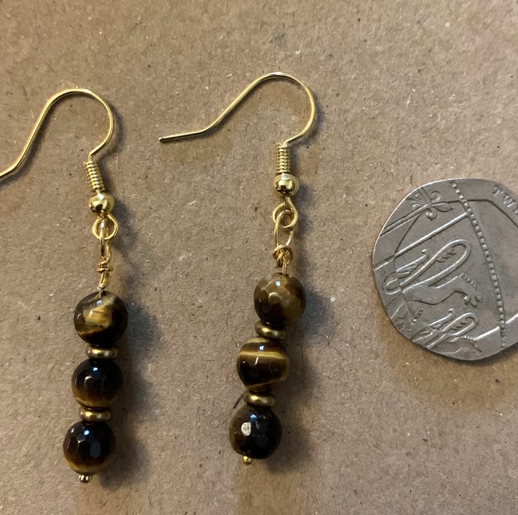 These dainty, understated earrings are crafted from tiger's eye gemstone beads and feature gold-plated fishhook wires. They are easy to wear during the day or for an evening out. The drop is 3 cm.