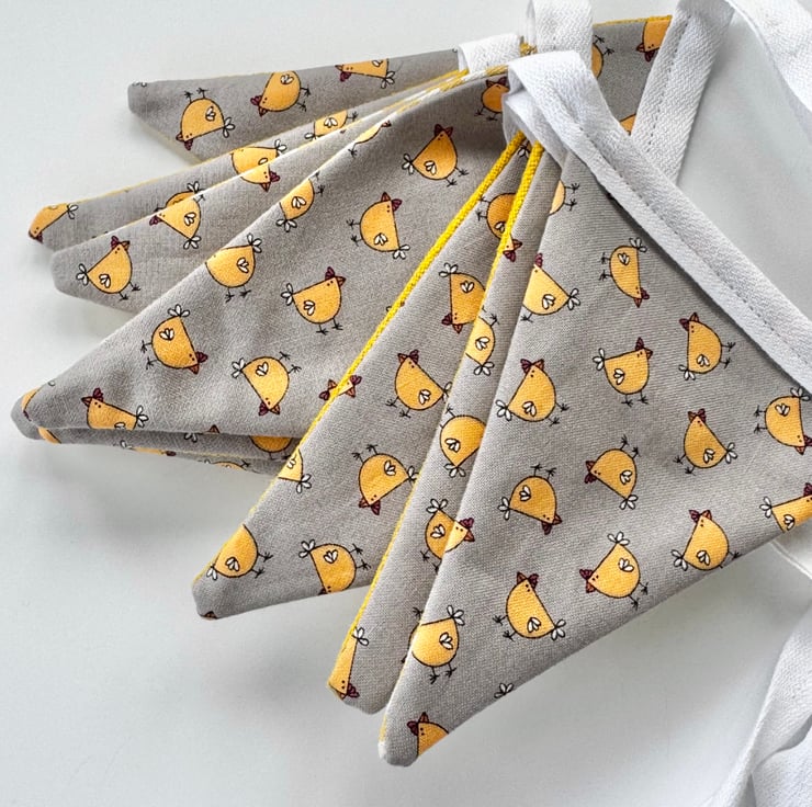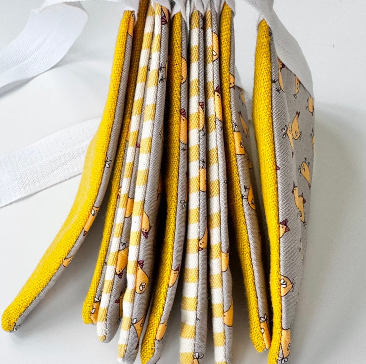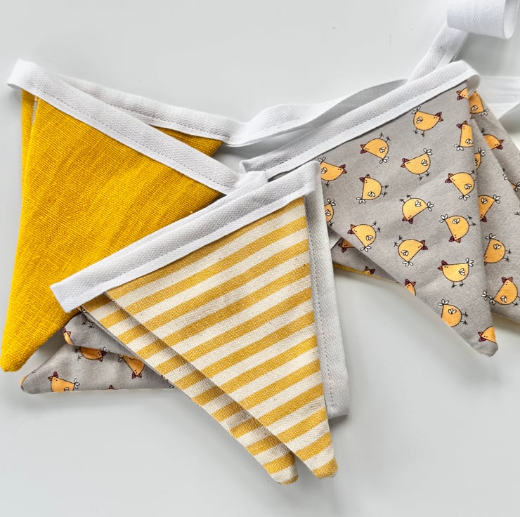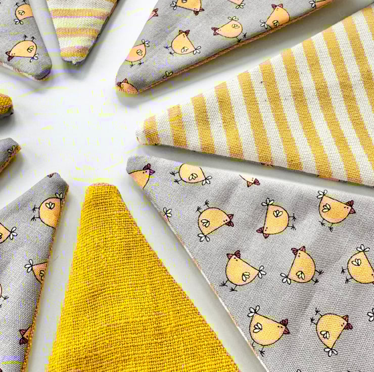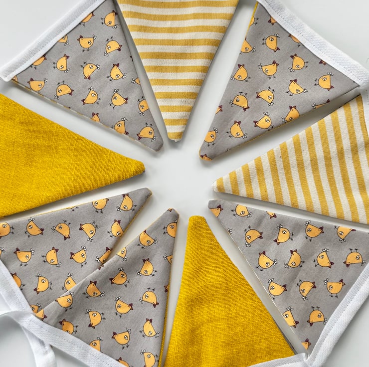 Bunting - nine double-sided flags featuring jolly little chicks printed on grey cotton, plus yellow and white stripes, and yellow washed linen.