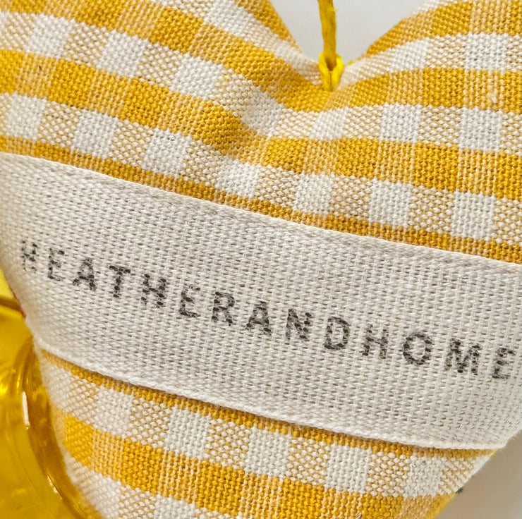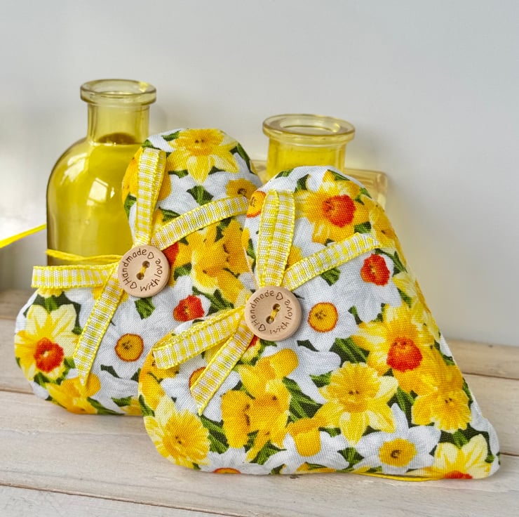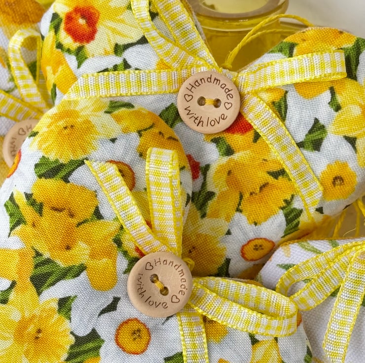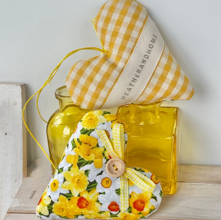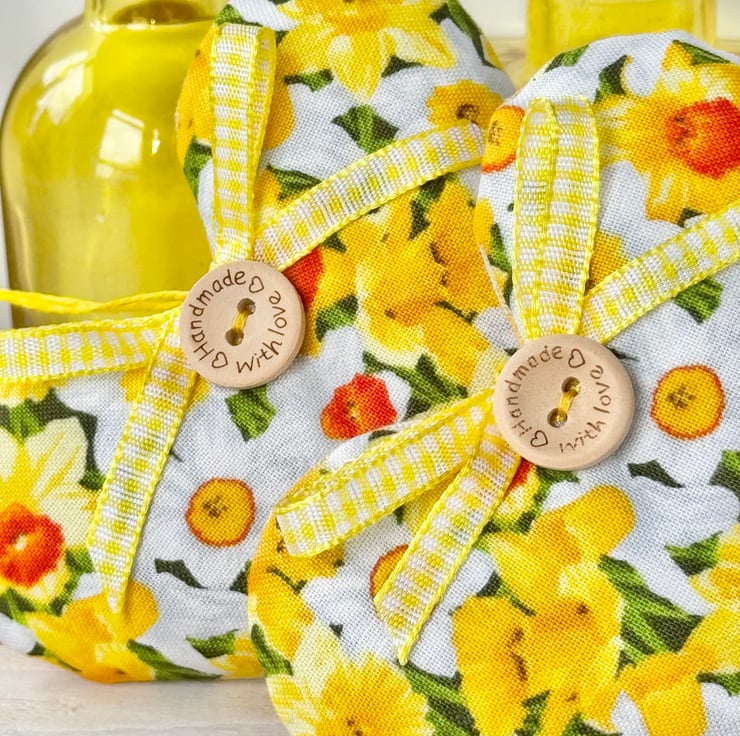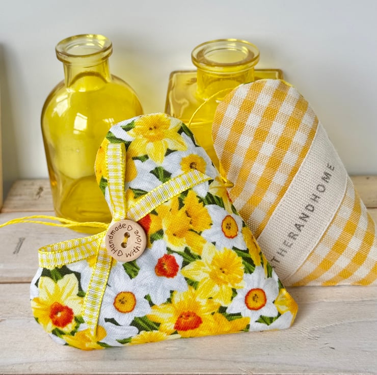 A sensational profusion of yellow, orange and white daffodils fill the front of this joyful heart decoration, and are complemented by the yellow gingham fabric on the reverse side. Filled with super scented and long-lasting lavender, and finished with yellow hemp twine hanging ties, a yellow and white gingham ribbon bow and a round wooden button bearing the heartfelt legend 'Handmade with love' ...