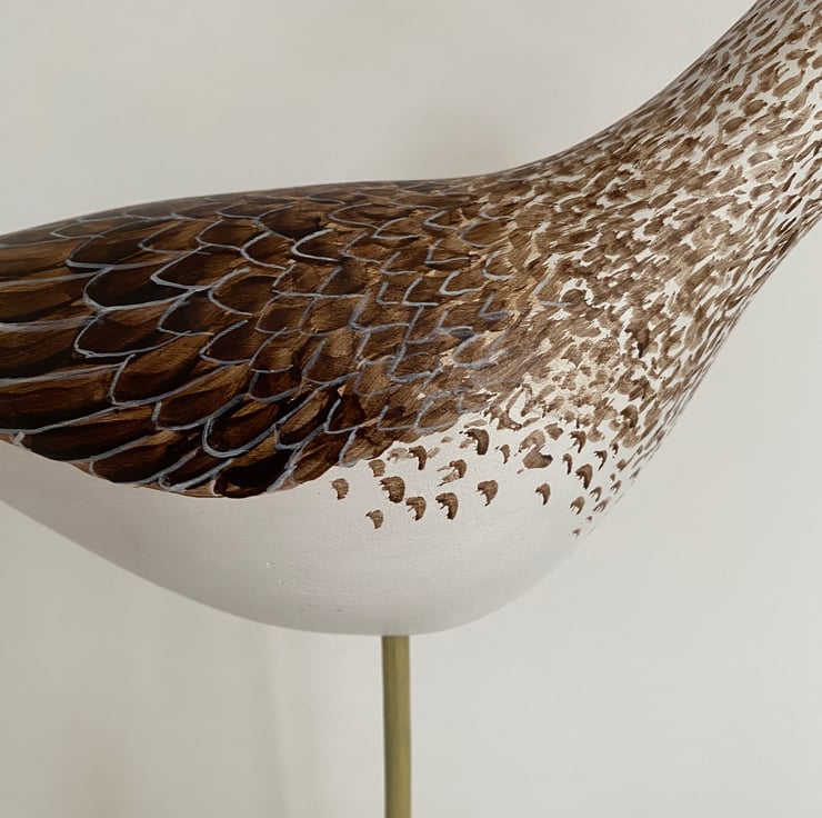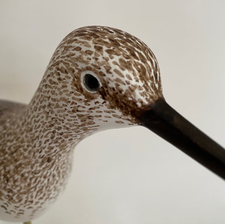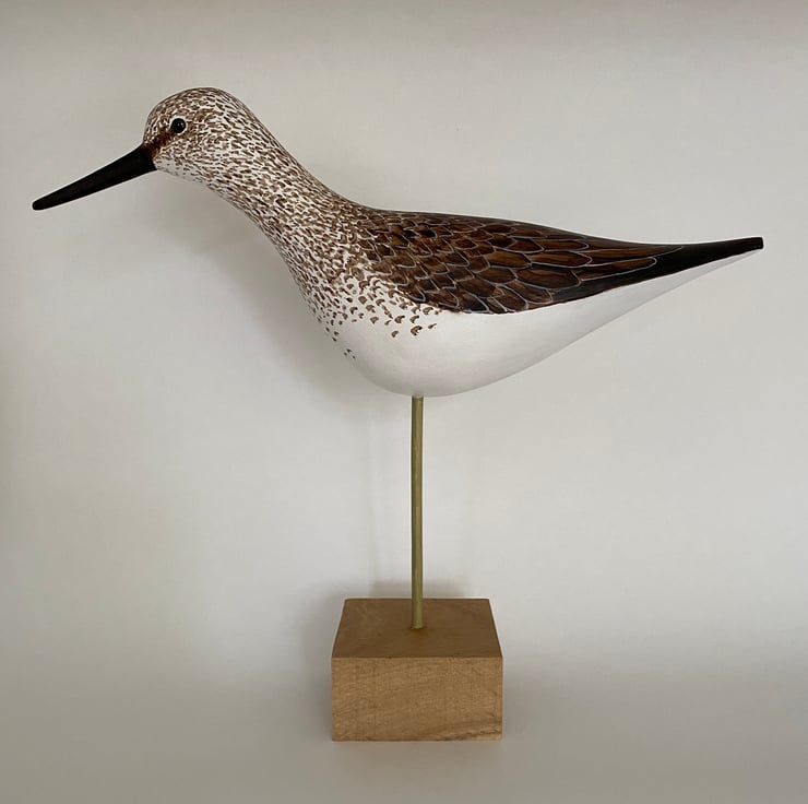 I have hand carved this little greenshank from jelutong. It has been sanded, primed and then painted with artists acrylics. It has hand coloured glass eyes and is mounted on an ash block. I have given it a coat of wax to give a soft shine. It is 27cm from beak to tail, 6cm deep and 24 cm tall. I don't paint with feather perfect detail but always hope to catch the character of the bird.