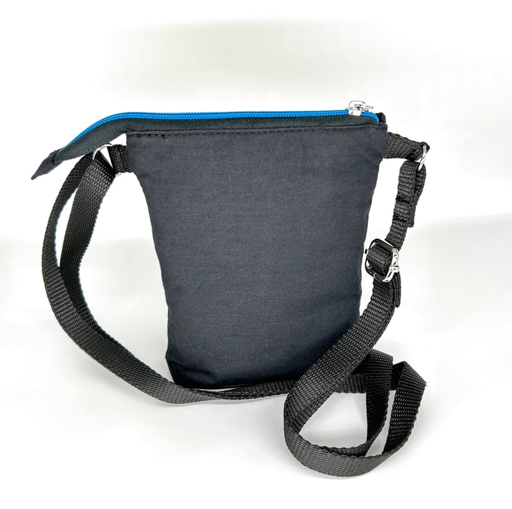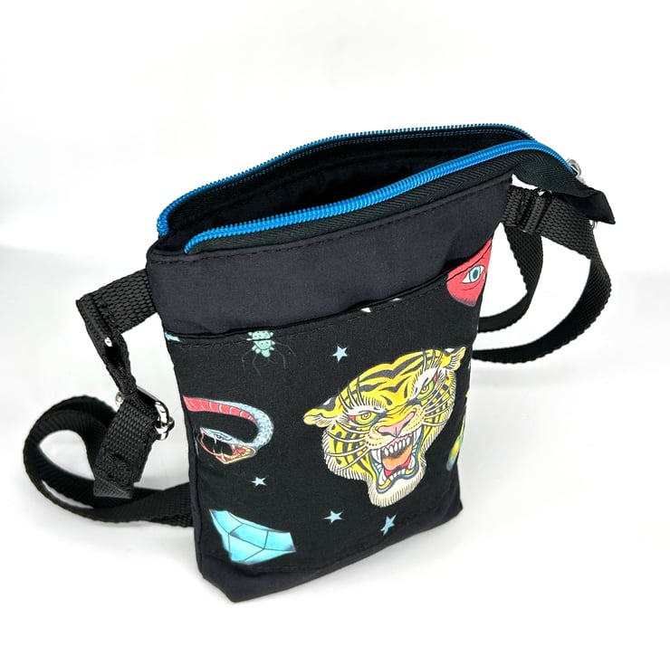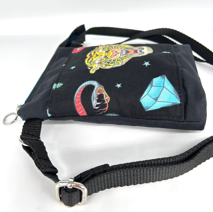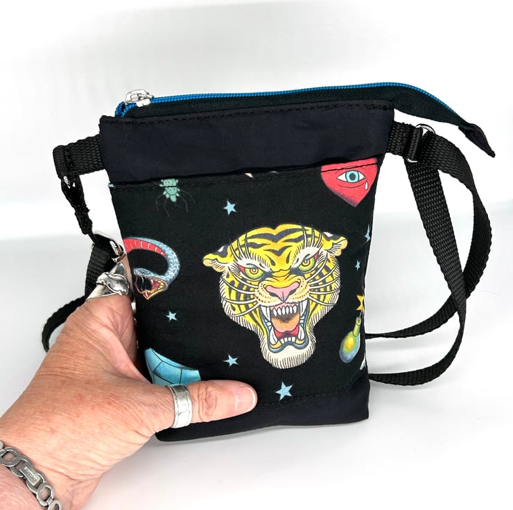 Here is a handmade tattoo style crossbody bag with a tiger print on the front pocket. All fabric is 100% cotton. There are two slip pockets, one on the front and one inside. The base of the bag is boxed making room to carry a mobile, glasses, keys, coin purse, credit cards and other small everyday items.
