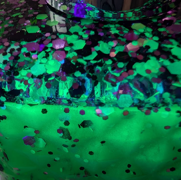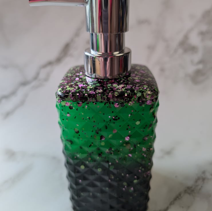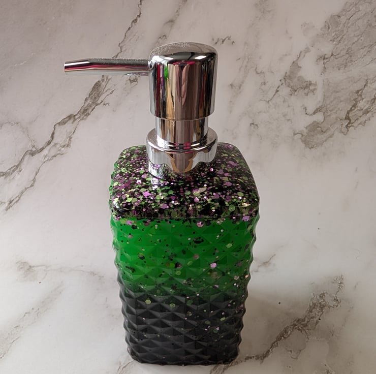 Handmade in Belfast, this glow-in-the-dark resin soap dispenser looks like it came straight out of a potion lab. The glass-textured base fades from deep black to bright green, with a shimmering mix of purple and green glitter across the top — because every witch deserves a little sparkle at the sink.