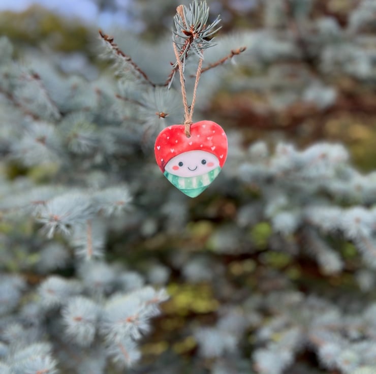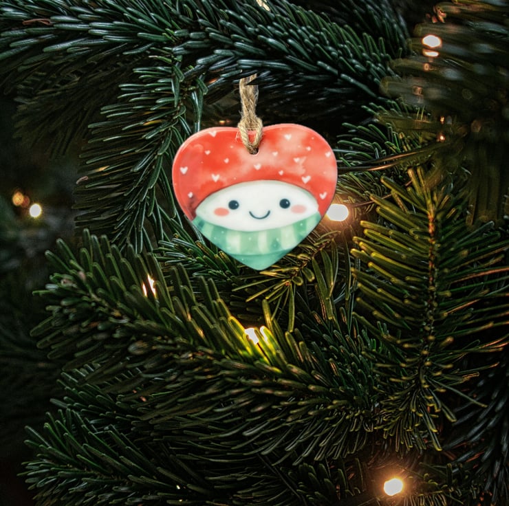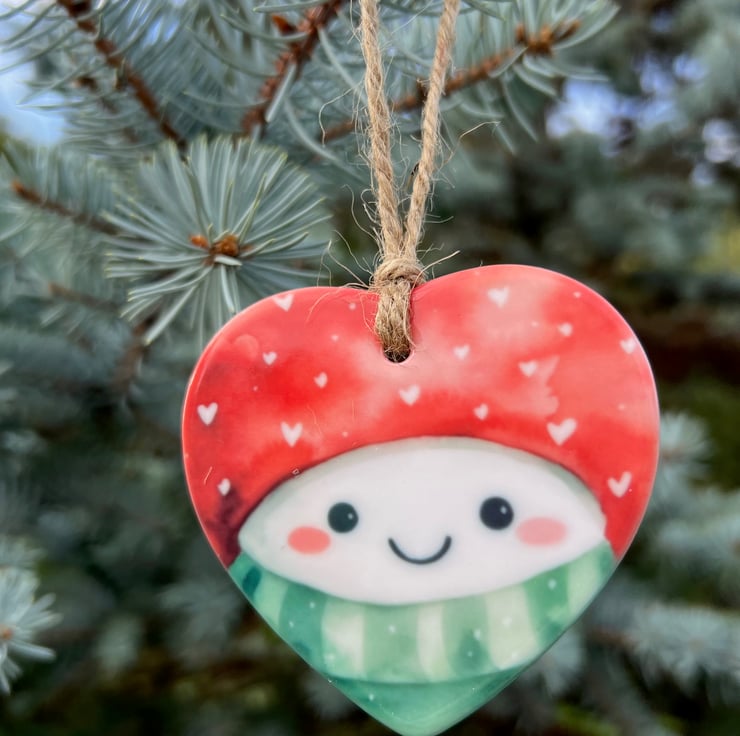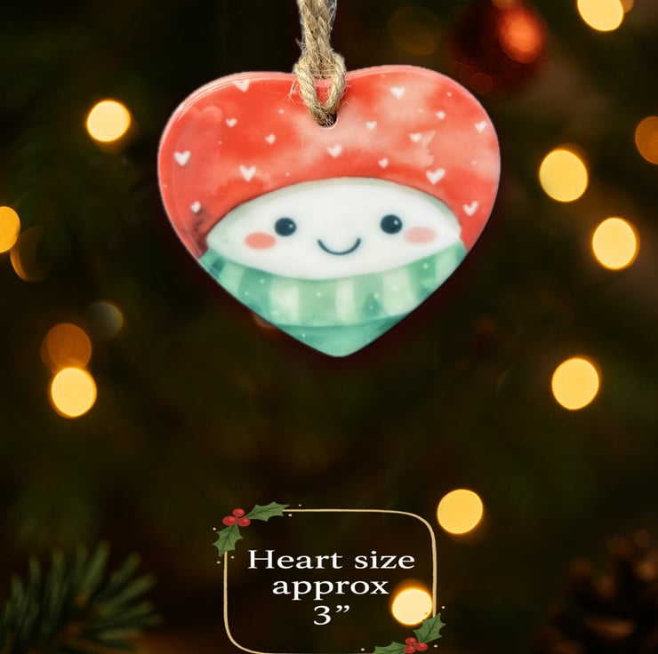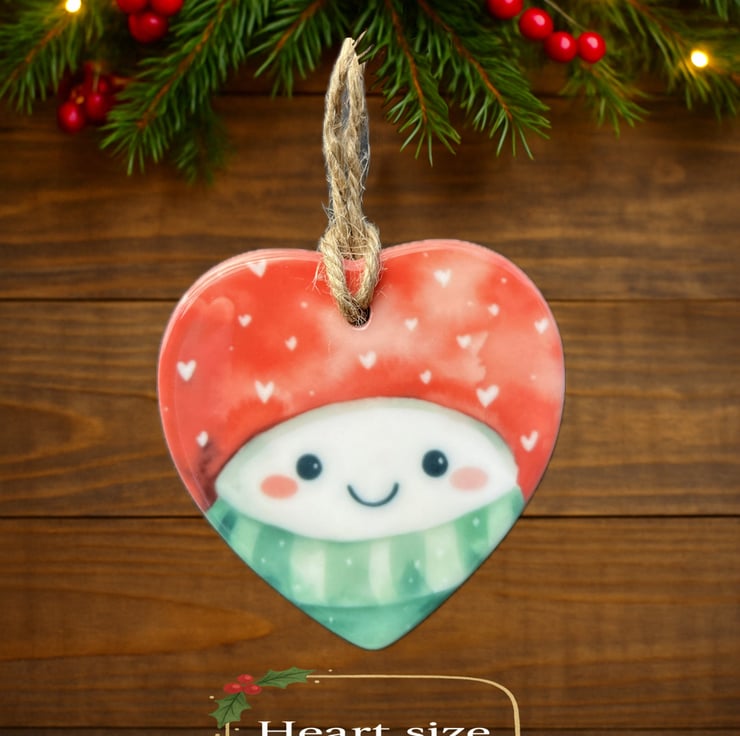 Bring a smile to your Christmas tree with this handmade ceramic heart ornament, featuring a cute snowman face in a cosy red hat and green scarf — a festive favourite for all ages