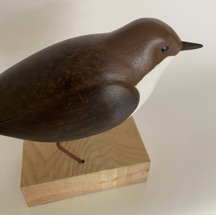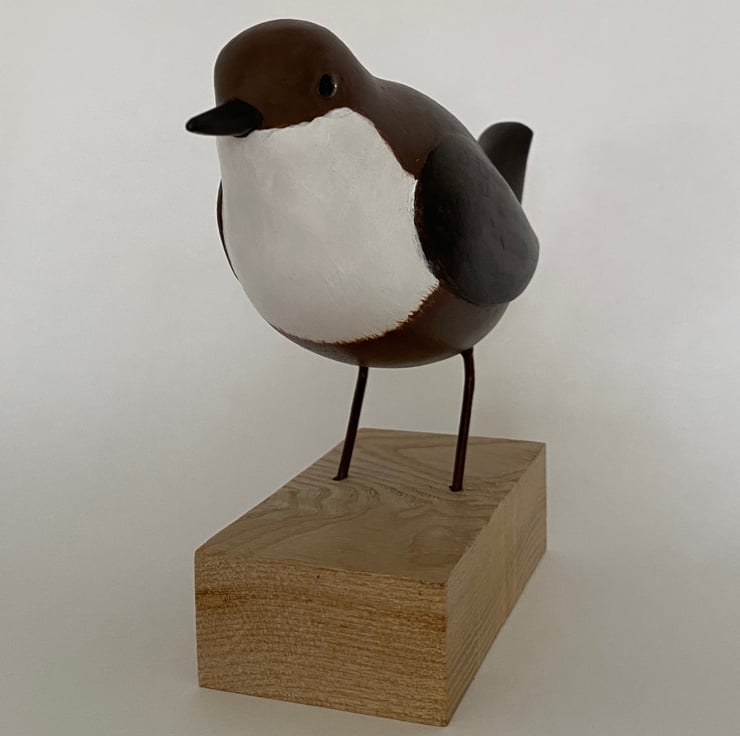 This dipper has been hand carved from jelutong. It has raised wing detail and bent metal legs as well as hand coloured glass eyes. I have sanded, primed and painted it with artists acrylics and given a final coat of wax to give a soft shine. It is mounted on an ash block and is 16cm from beak to tail, 6cm deep and 13cm tall overall.