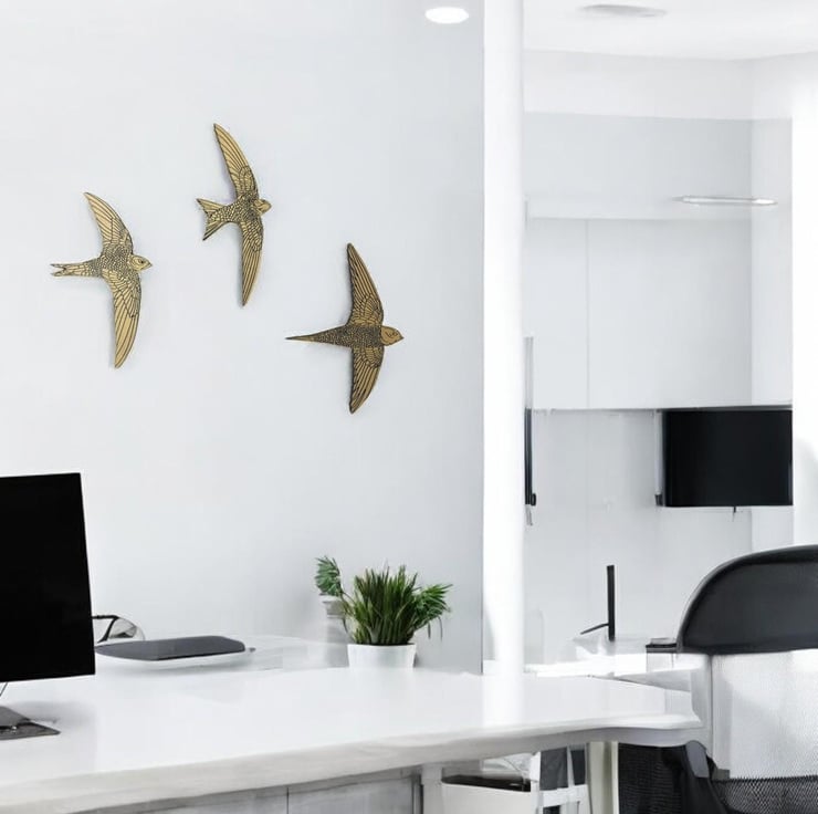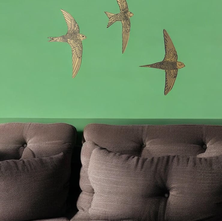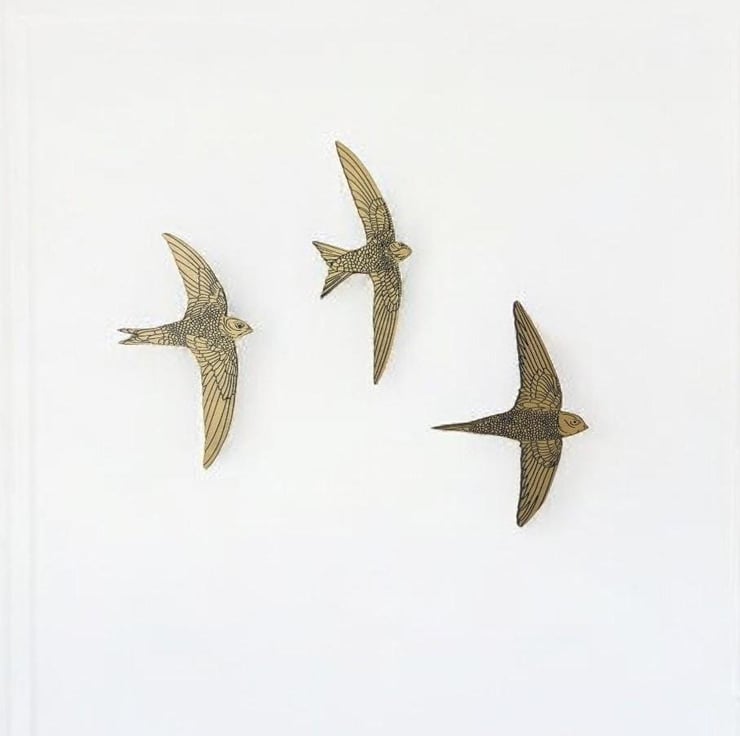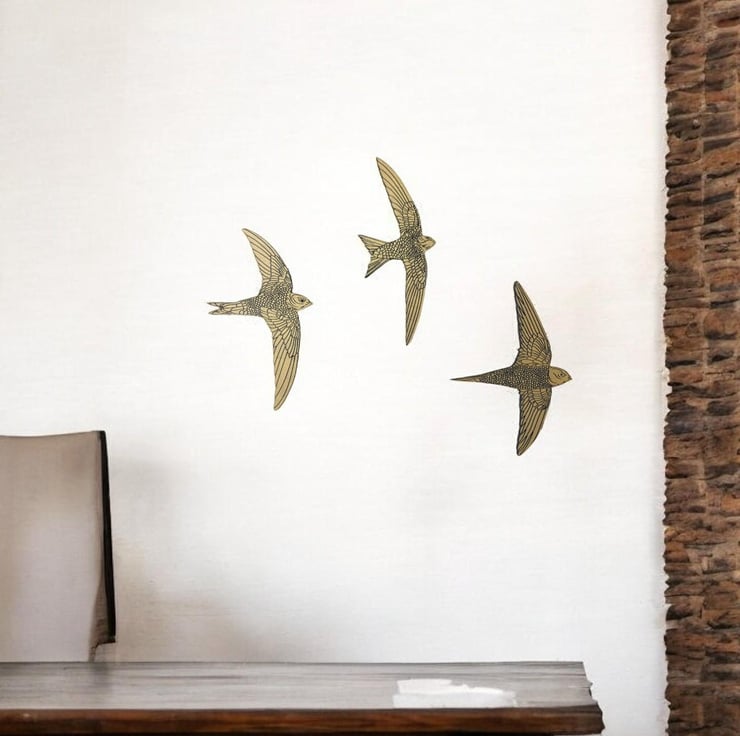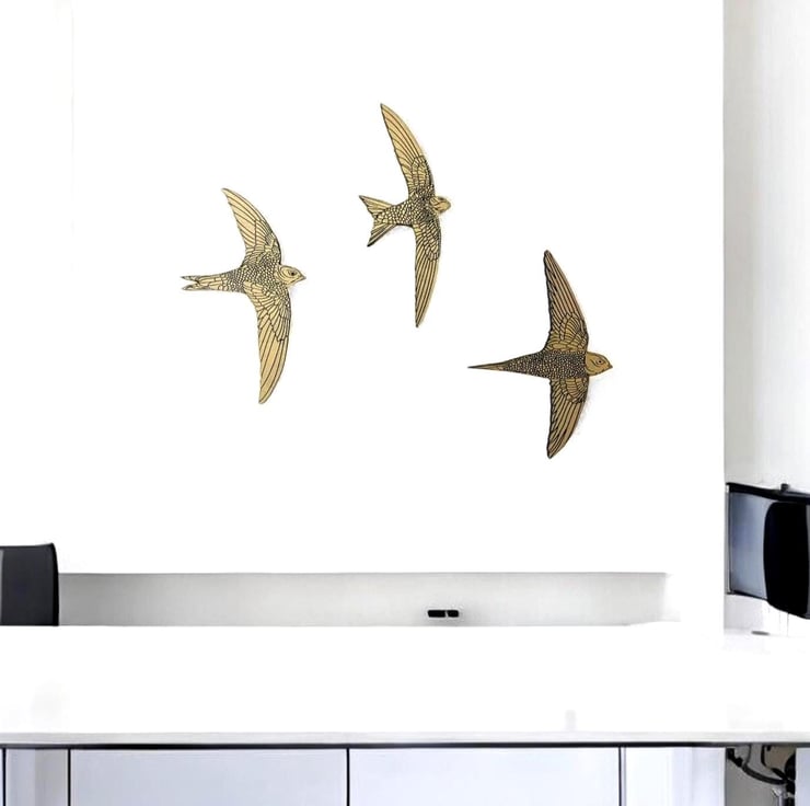 Inspired by the stunning swifts that migrate over our studio and we wanted to bring a touch of nature indoors with this stunning set of 3 gold-painted swifts. Each bird is laser-engraved and hand-finished for a one-of-a-kind look that adds elegance and movement to any space.