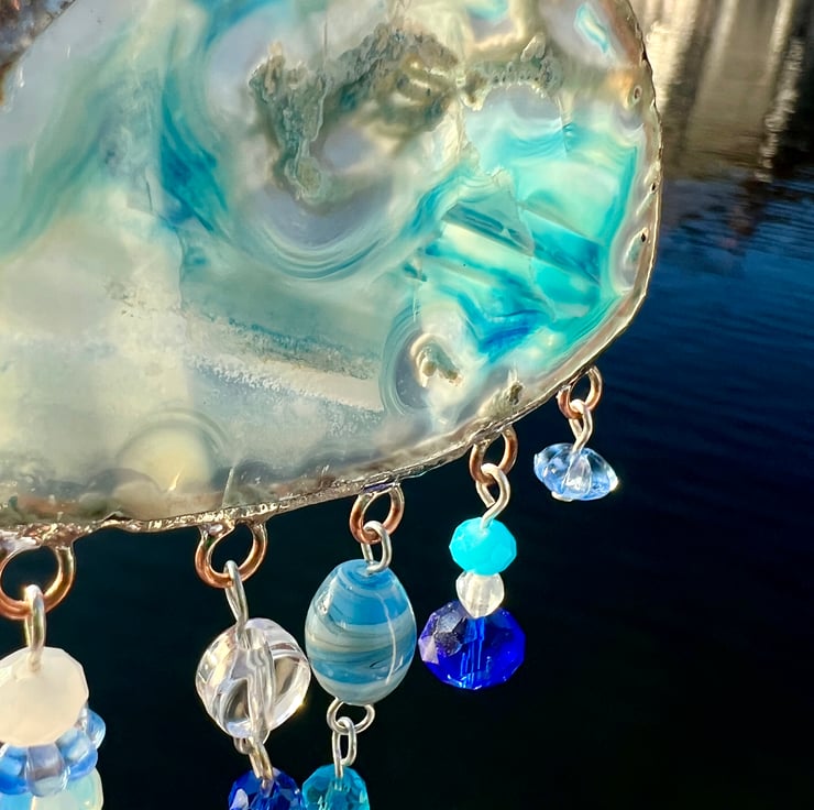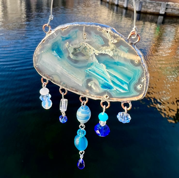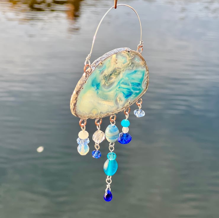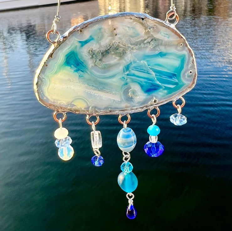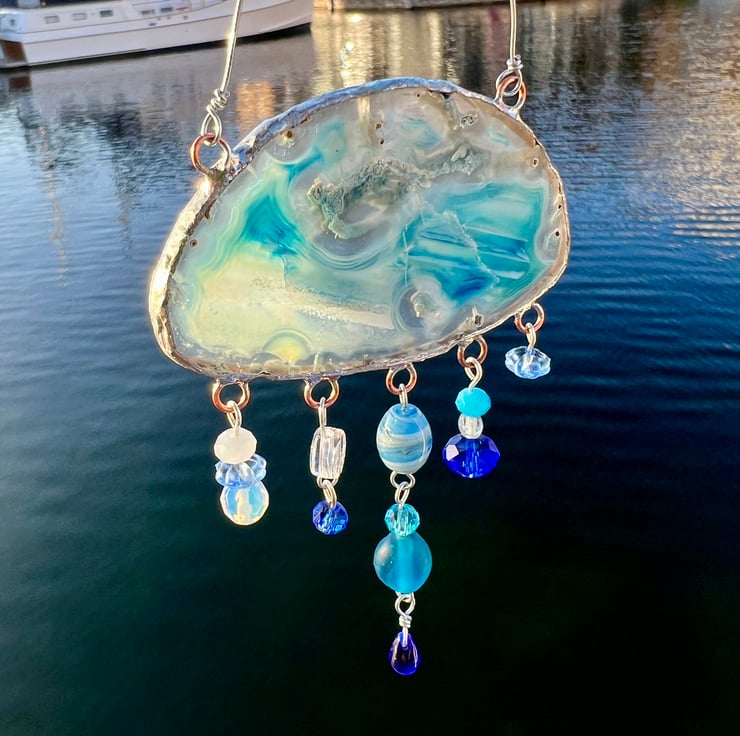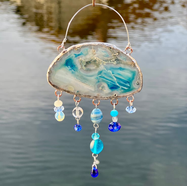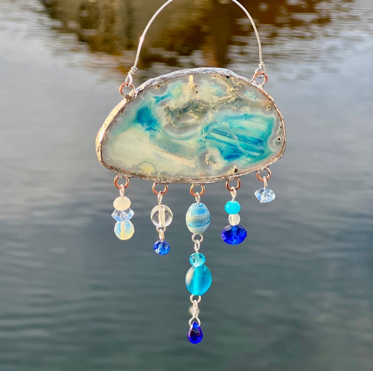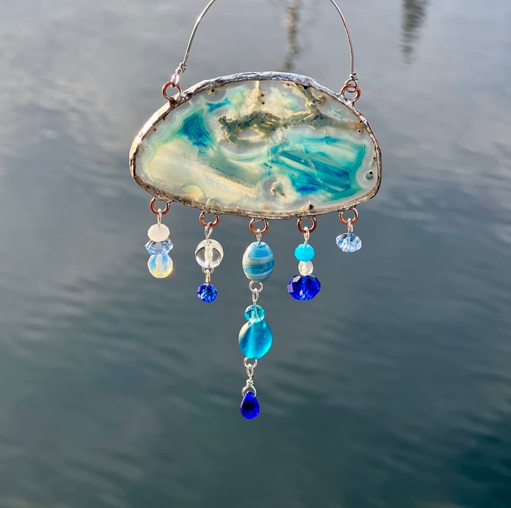 A little hanging cloud made from a beautiful slice of natural agate, embellished with glass beads and droplets.