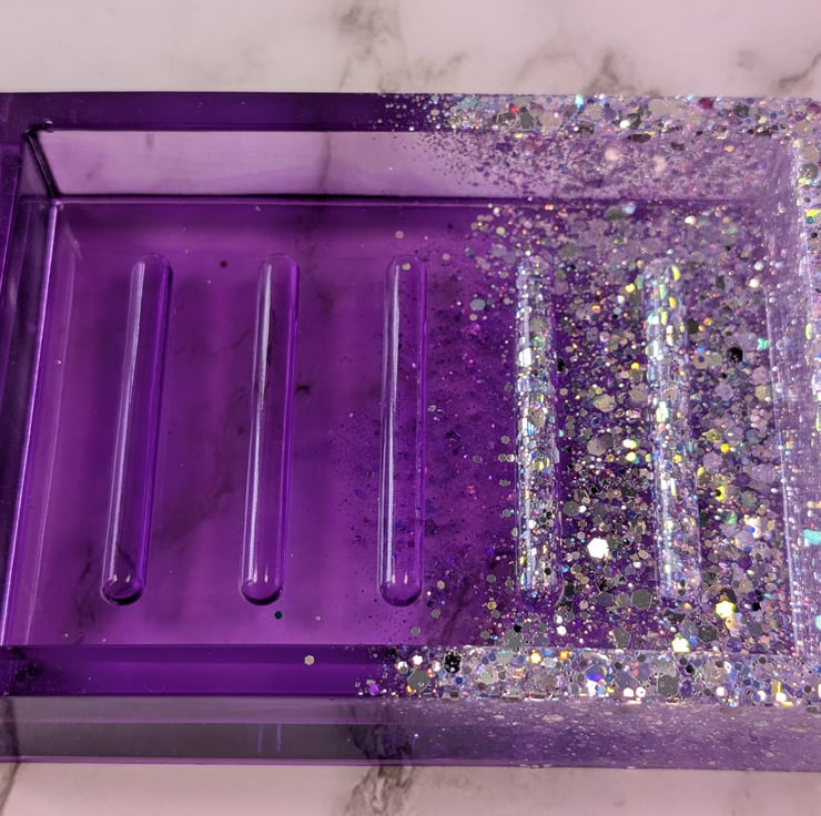 Each piece is individually poured using high-quality epoxy resin, creating subtle variations in colour and sparkle that make every soap dish unique. The ridged design helps your soap dry between uses while doubling as a decorative accent that feels indulgent without trying too hard.