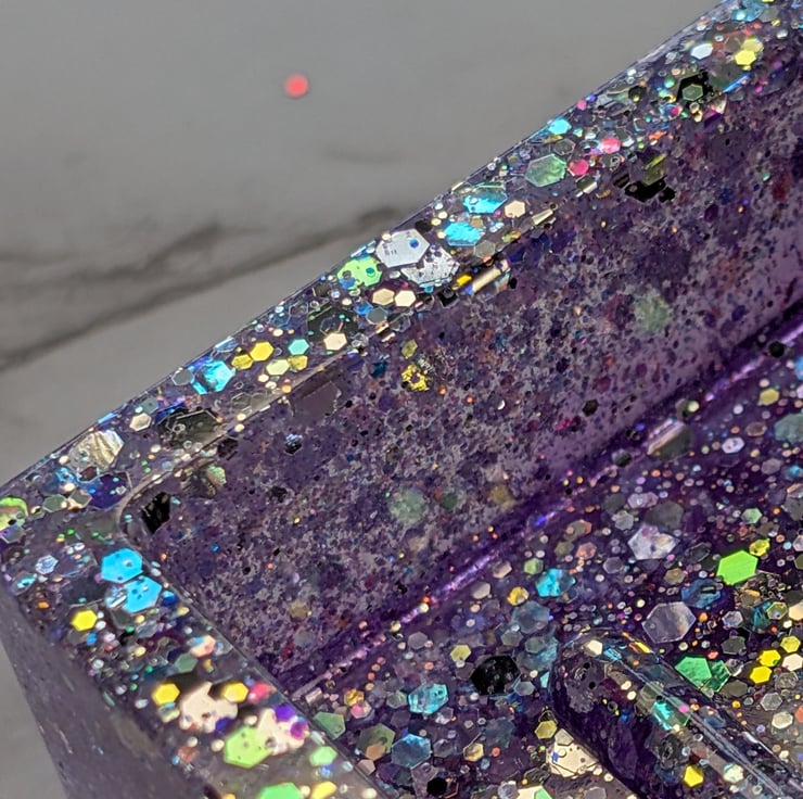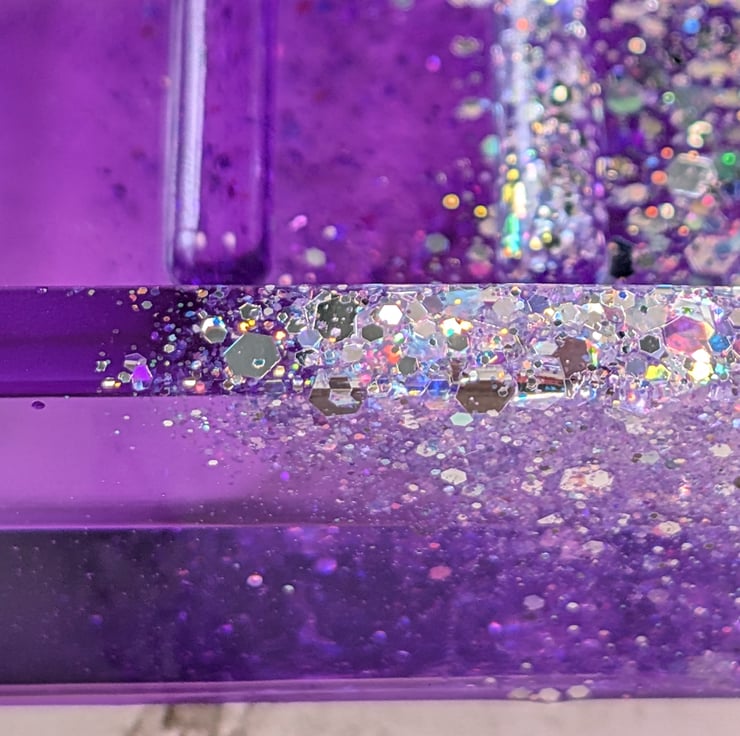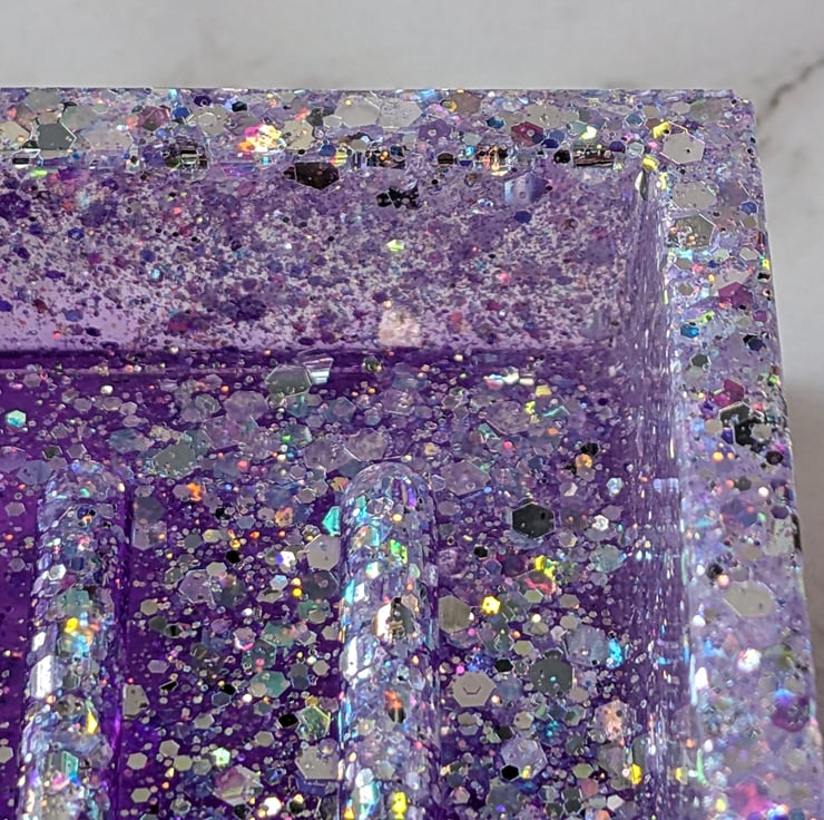 Handmade in Belfast, this resin soap dish blends everyday practicality with a touch of luxury. The clear lilac base fades into a cascade of silver and holographic glitter, catching the light beautifully while keeping your sink area neat and stylish.