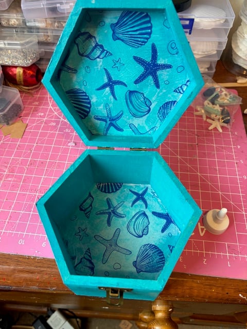 A beach-themed hexagon shaped jewellery box decorated with seashells and decoupage shell shapes inside, measuring approx 15cm in diameter and 8.5cms in depth.