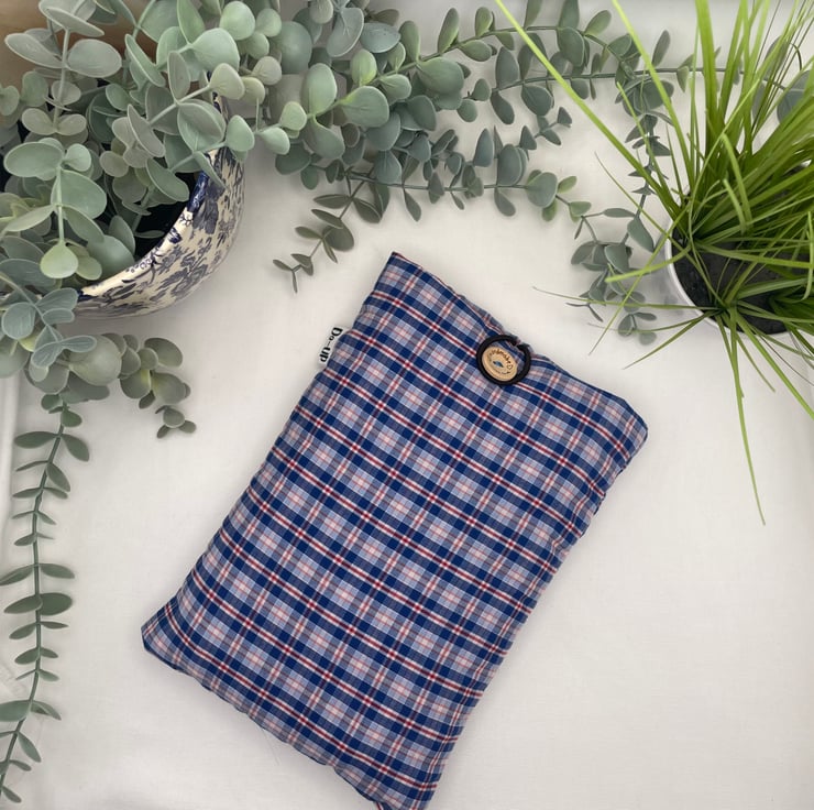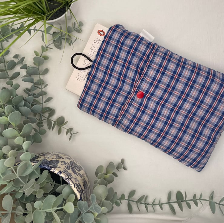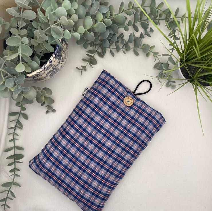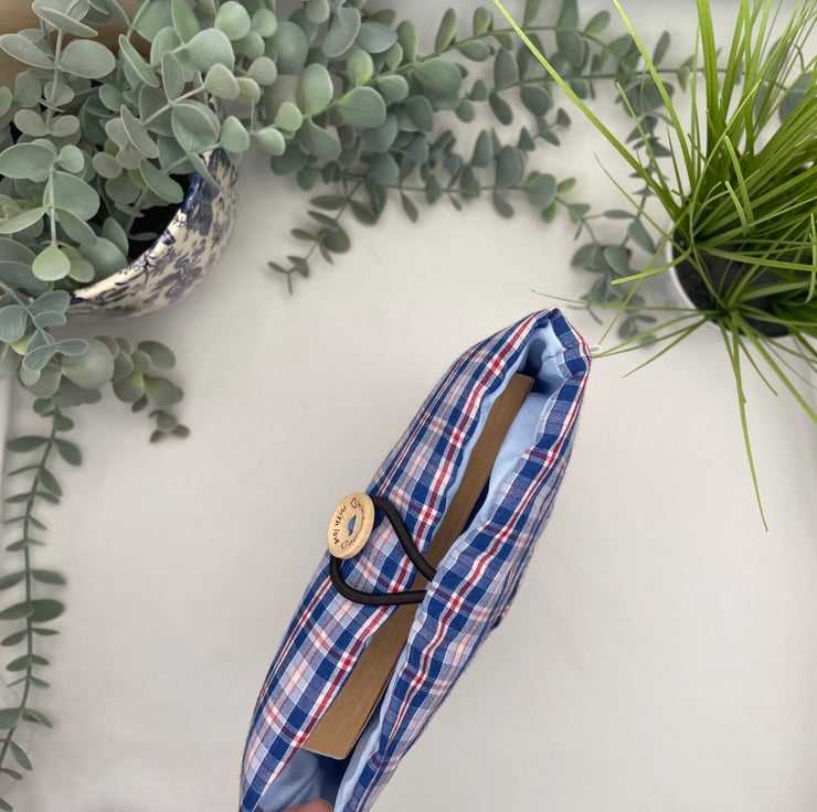 This lovely book sleeve is hand made with predominantly recycled materials. Some parts have newly sourced materials (e.g., buttons, thread and hair ties etc). It is 9-9.5 x 6 inches (approx). This has a pocket on one side for additional items such as pens, notebooks or snacks. These book sleeves are handmade from recycled materials and will hold a standard sized paperback book. They are great for travelling or just for in your bag to keep your book protected.