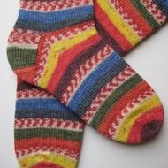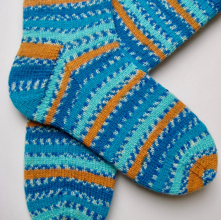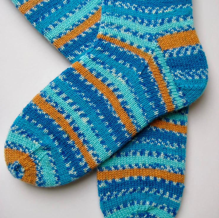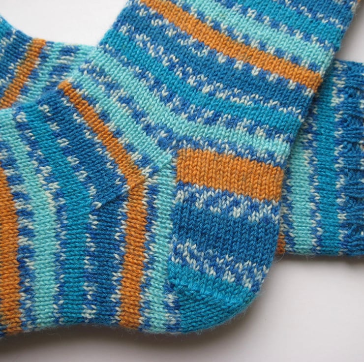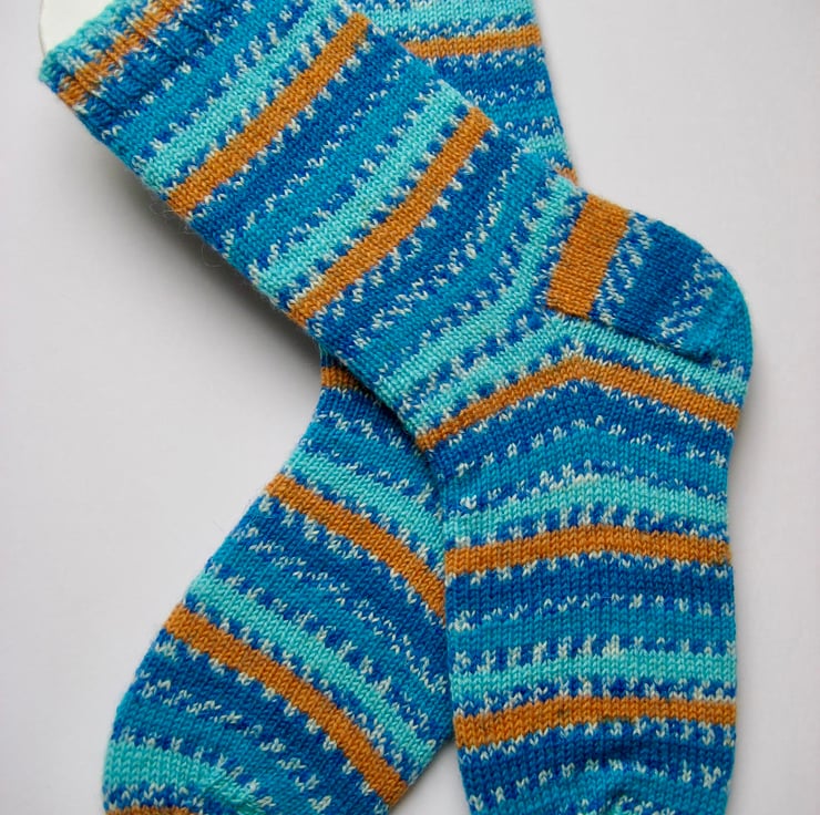 Hand knitted matching wool socks made from 4 ply self patterning sock yarn, 75% wool 25% polyamide in stripes of blue, orange and cream. Made from very fine yarn, they are not too thick and will fit most footwear. Warm and durable, these socks will keep your feet comfortable and bright throughout the year.