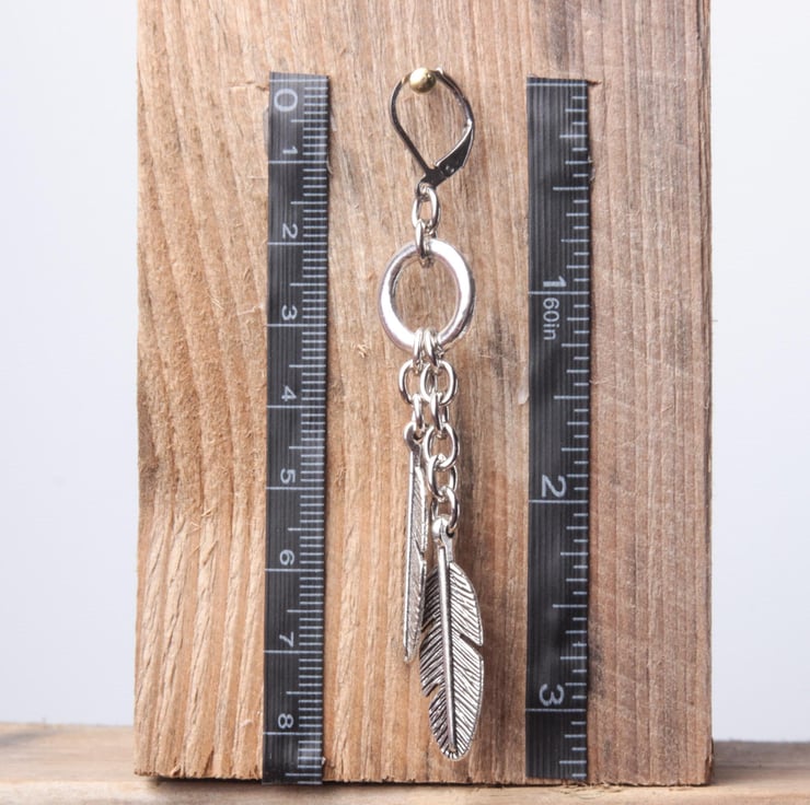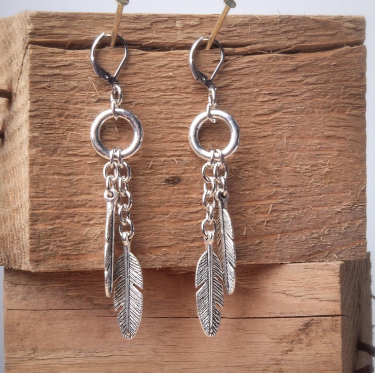 These earrings feature two intricately designed Tibetan silver feathers that dangle from chains attached to rings. The total length of the earrings is approximately 3.25 inches, including the stainless steel lever back ear wires.