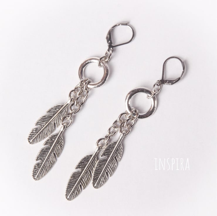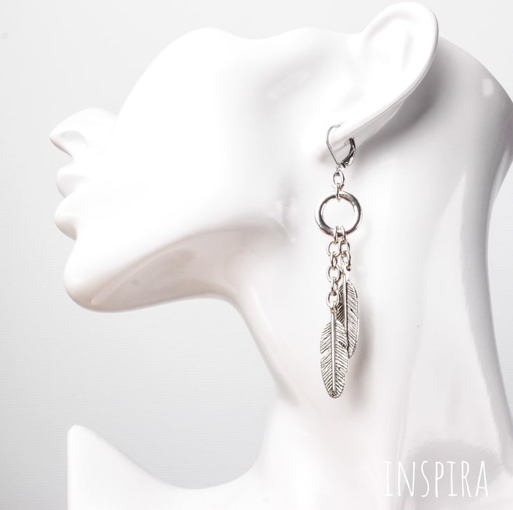 Silver feather earrings - long chain dangle stainless steel lever back earrings