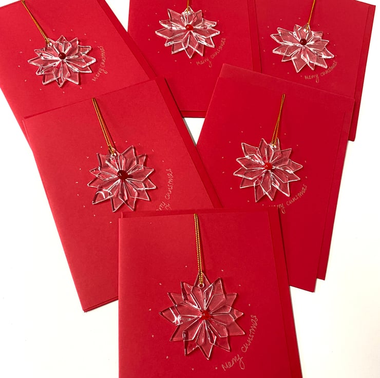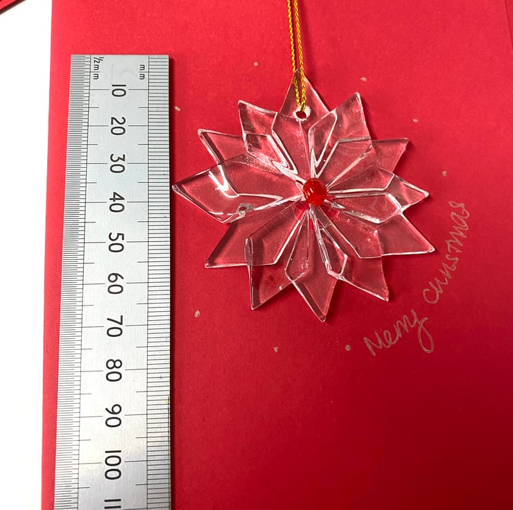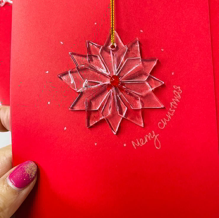 What a fab way to give a card and a gift in one . Send a card that can then be used year after year . The gorgeous fused glass decoration is drilled and strung with gold thread so ready to hang on the Christmas tree for the following year . Each glass decoration is approximately 7cm tall with a centre red glass bead . A special Christmas card for the special people in your life . Cards come with envelope in a clear protective film . Blank inside for your own message .