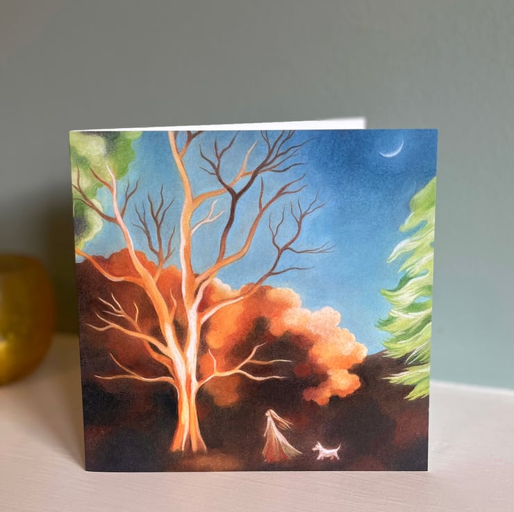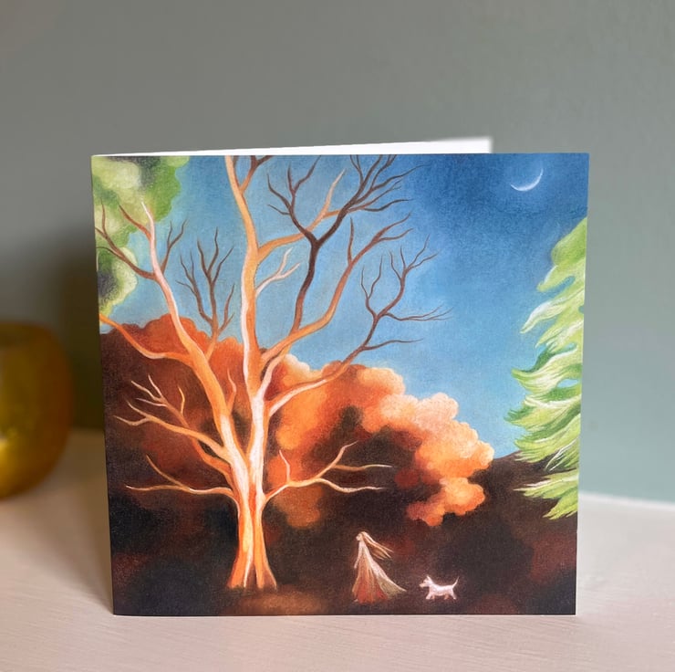 I was first inspired to create this illustration when I saw an orange lit up tree on a magical night walk in Kew Gardens (London). The appearance of the woman, the scottie dog and the crescent moon, came from my imagination. There is a feeling of timelessness and the orange glow creates a magical, mystical atmosphere.
