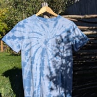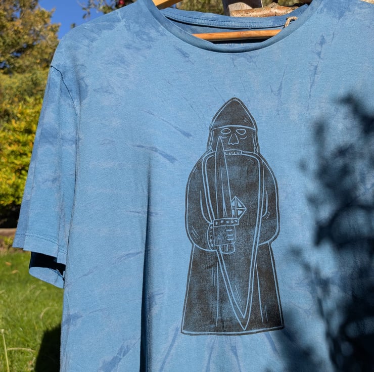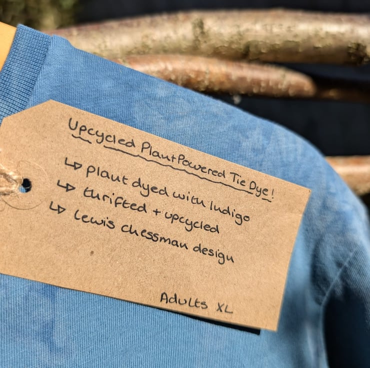 Upcycled T-shirt that has been naturally tie-dyed with Indigo, with a Lewis Chessman printed design on the front
