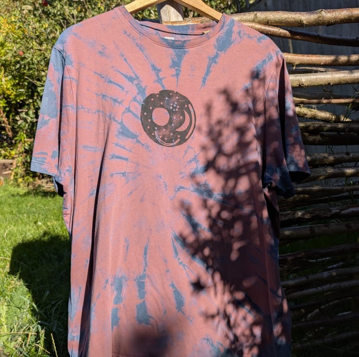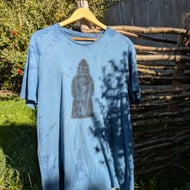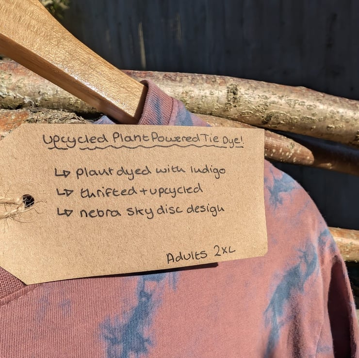 Upcycled T-shirt that has been naturally tie-dyed with Indigo, with a Nebra Sky Disc printed design on the front