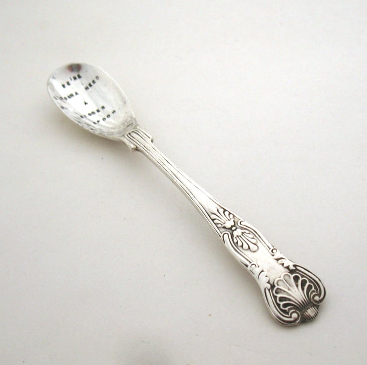 We're almost certainly gonna need a bigger spoon than this one. It's a little vintage condiment spoon a mere 10.5cm long. It has an elaborate 'Kings Pattern' handle, it's silver plated and in its tiny elongated oval bowl I have stamped in tiny letters WE'RE GONNA NEED A BIGGER SPOON.
