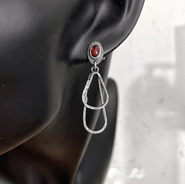 Red garnet stud earrings with freeform loop dangles.