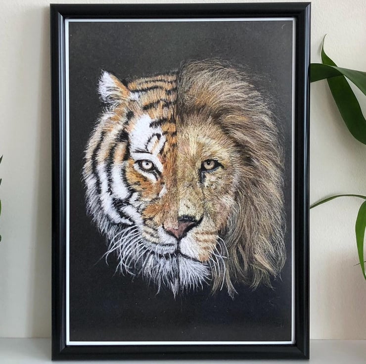 This was the first piece in my Chimera series, inspired by those real-life chimera cats with perfectly split facial markings. I was drawn to the idea of combining animals with shared symbolism — strength, power, majesty — and seeing how those qualities interact visually and emotionally in one form.