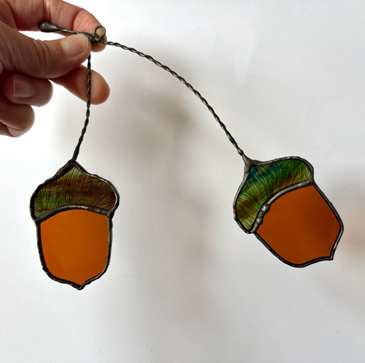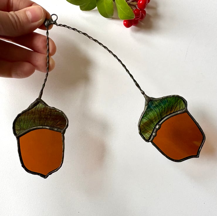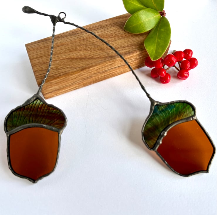 This hanging suncatcher features two stained glass acorns on a branch. It has been inspired by autumnal woodland walks and warm colours of falling leaves.
