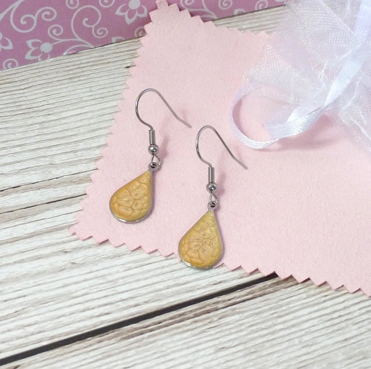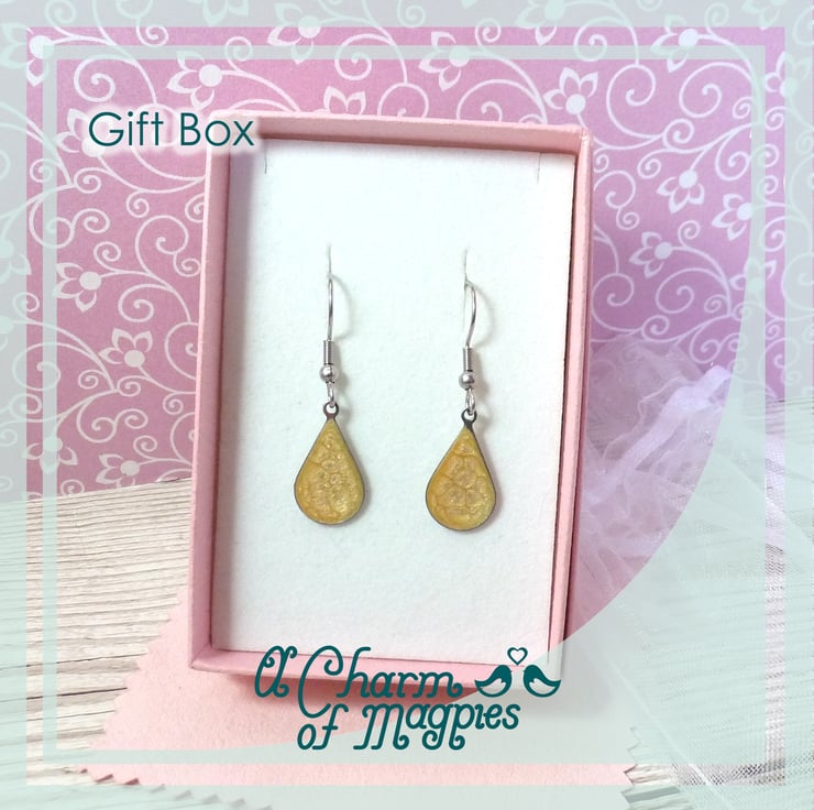 The small and dainty golden yellow teardrop earrings are made from Stainless Steel and bright yellow enamel. They're very comfortable to wear, being less than 1g in weight and the wires are also made from stainless steel.