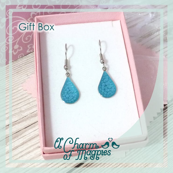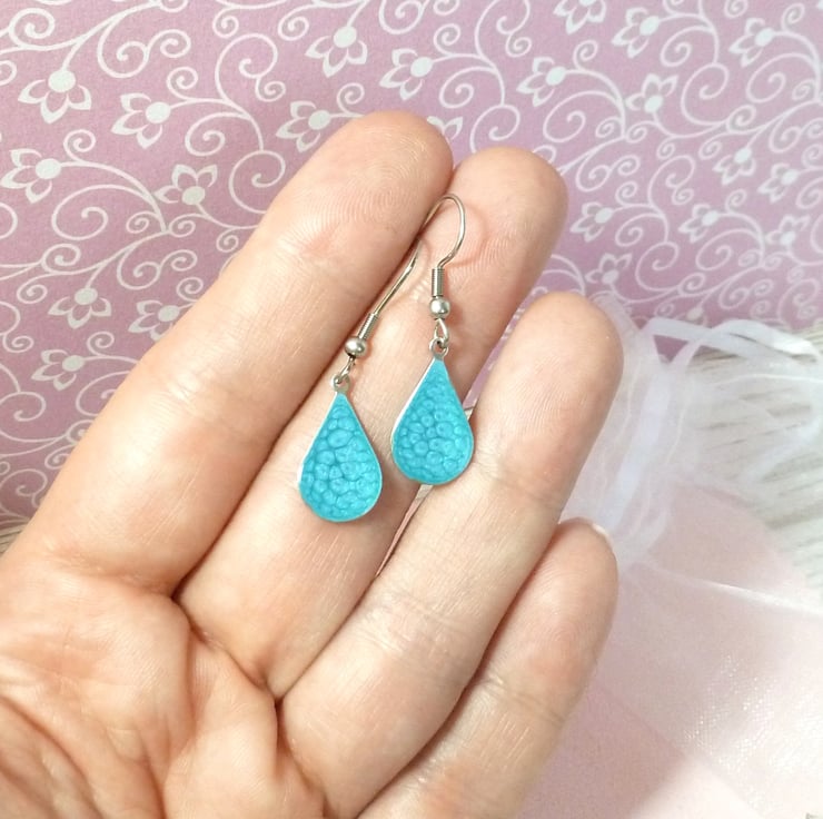 The small and dainty turquoise blue teardrop earrings are made from Stainless Steel and a metallic bright turquoise enamel. They're very comfortable to wear, being less than 1g in weight and the wires are also made from stainless steel.