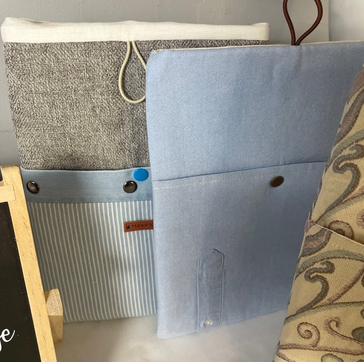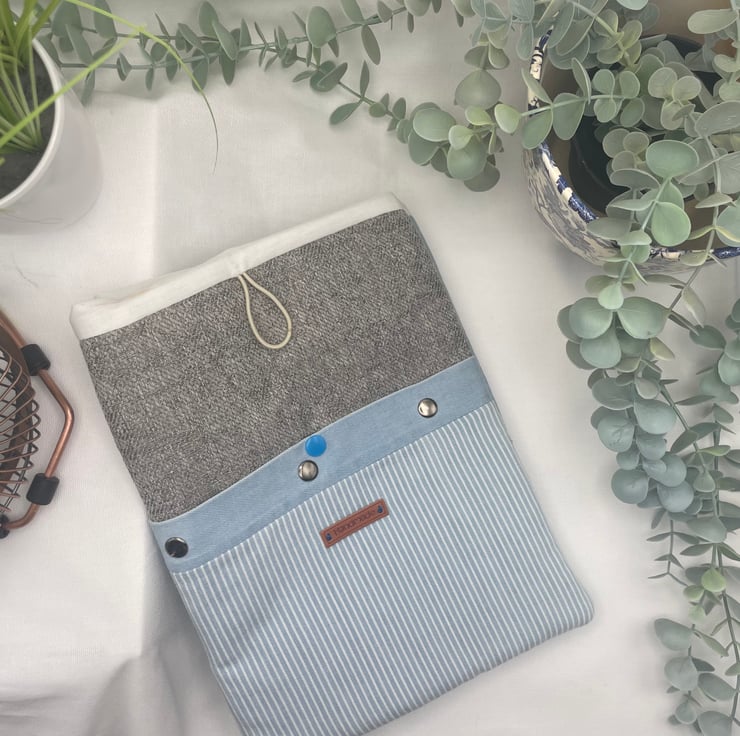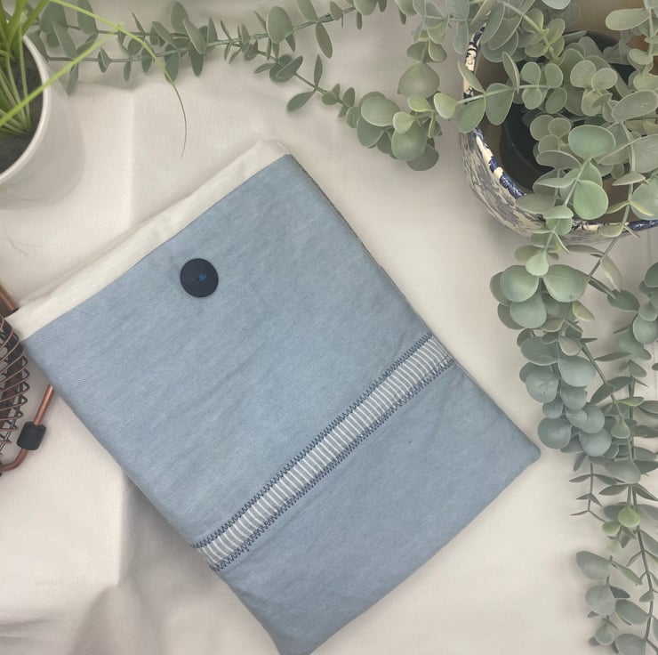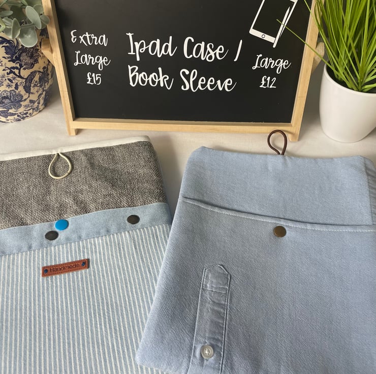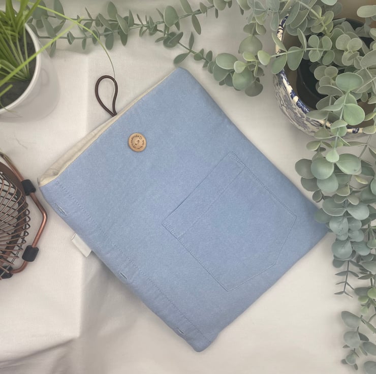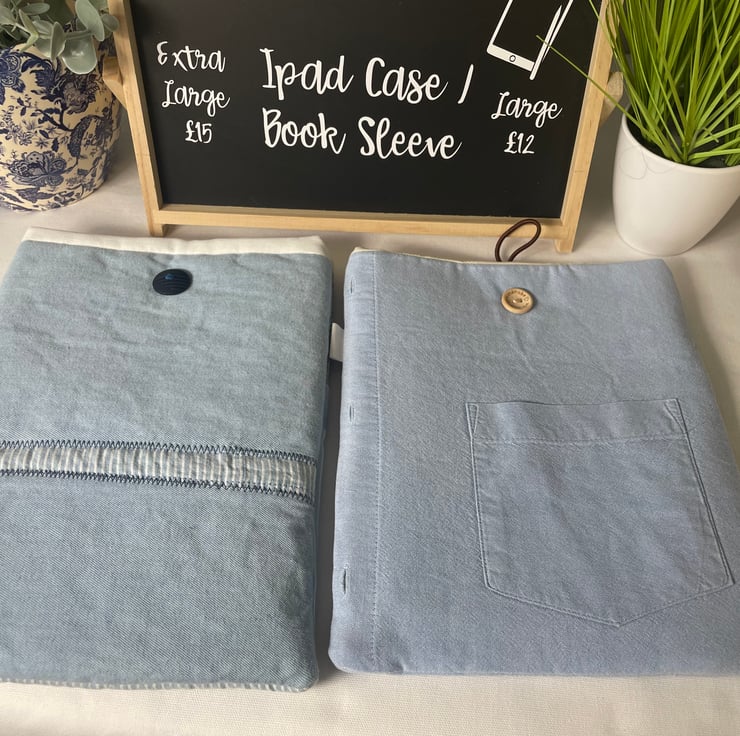 This lovely book sleeve is hand made with predominantly recycled materials. Some parts have newly sourced materials (e.g., buttons, thread and hair ties etc). It is 8 x 10 inches (approx) This has a pocket on one side for additional items such as pens, notebooks or snacks. These are so handy and such a unique quality handmade gift that really shows you care. Lots of previous customers have told me that they use them for travelling abroad or just to keep their iPads and/or books safe in their everyday bags.
