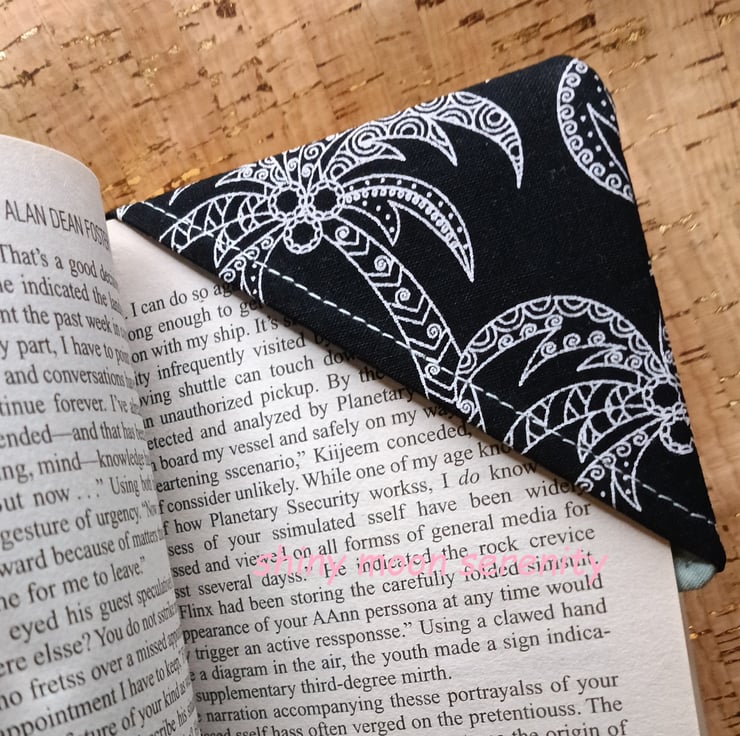 The back and corner pocket panels are made from a white printed palm tree on a black background cotton fabric. The lining is made from a sage green fabric.