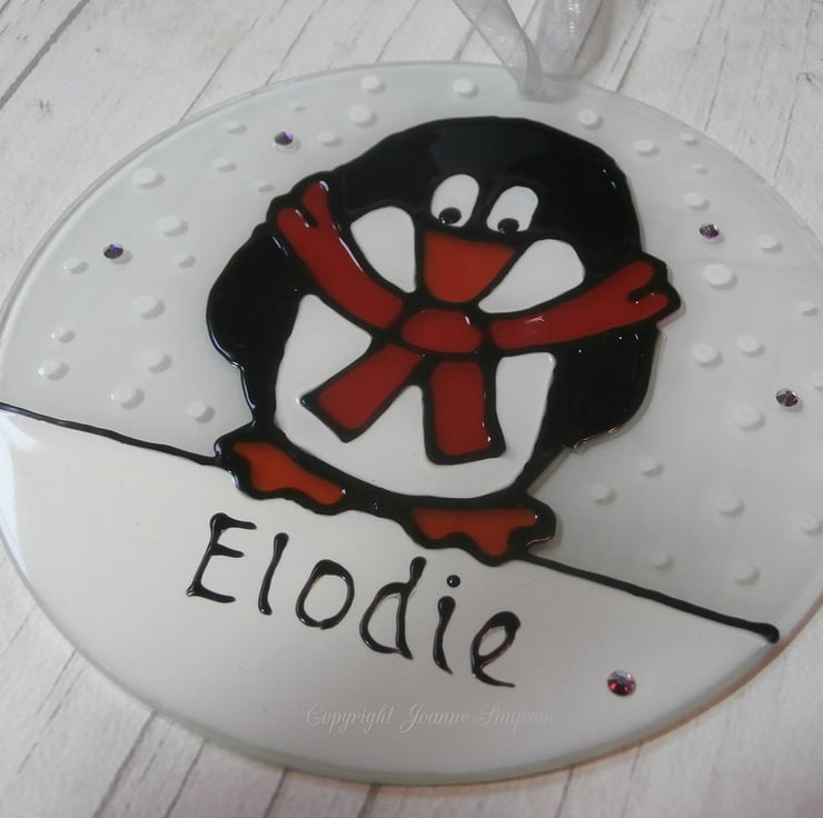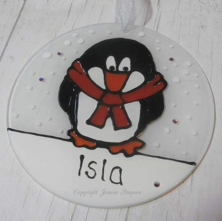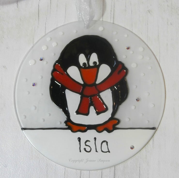 A lovely hand painted Christmas decoration featuring my Penguin design. Personalised. A single name, upto ten letters including spaces, can be added to the snow.