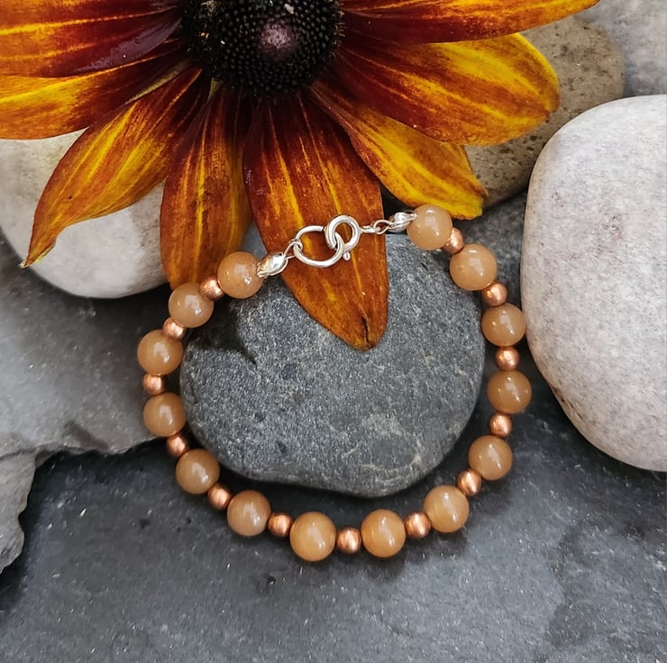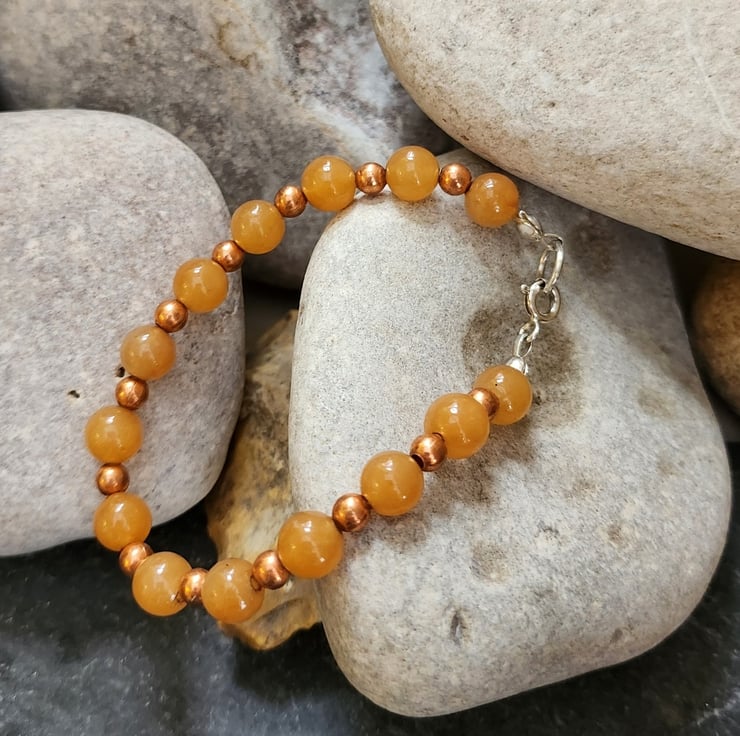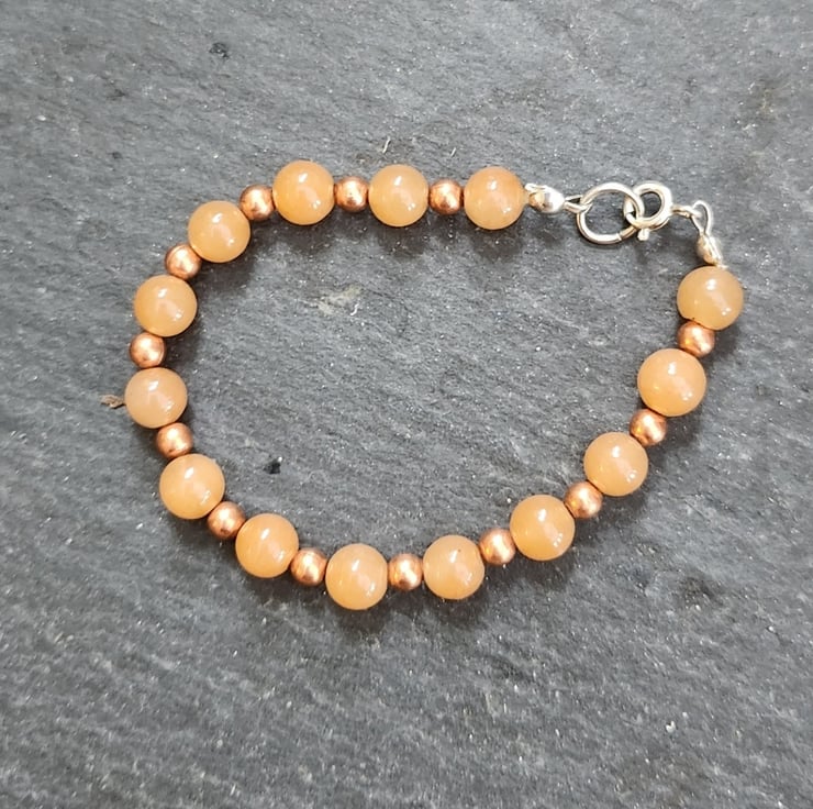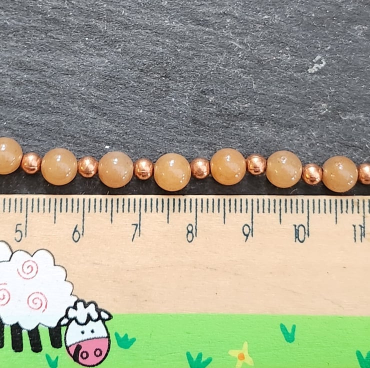 Delicate bracelet suitable for a child. 6mm aventurine stones alternating with smaller copper balls. To hold together there is double nylon thread for extra strength. Sterling silver connections and fastener findings. 16cms/6.3inches long.