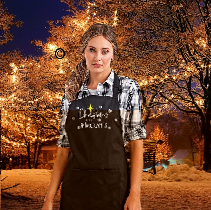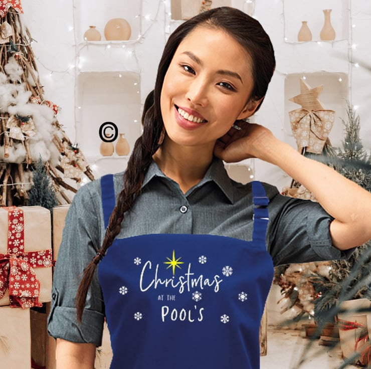 Add a touch of Christmas joy with this lovely personalised family apron. Your family name surrounded by snow flakes and the Christmas star will make the Christmas meal that bit more special.