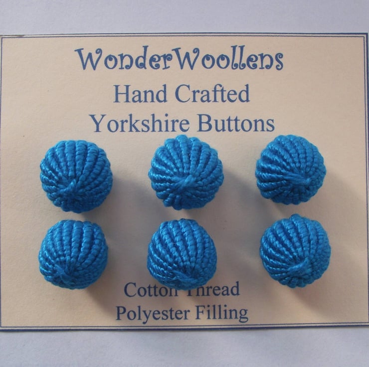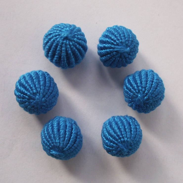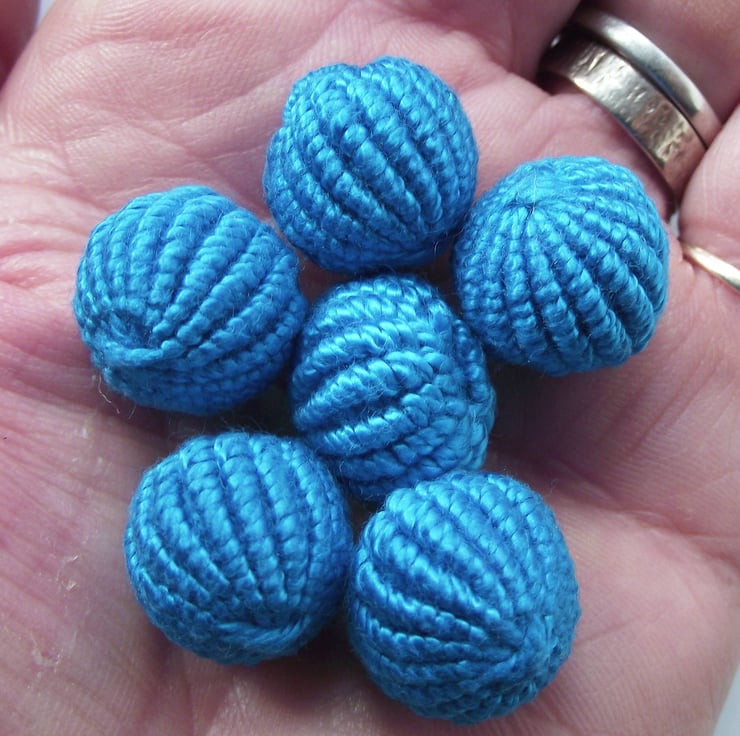 This listing is for a set of six spherical blue buttons, which have been intricately crafted using cotton thread. I would describe this blue as a rich turquoise. They are stuffed with safe polyester stuffing. They have integral shanks for ease of attaching to clothes, bags etc. As well as being used as functional buttons, they could be used as embellishments. Ideal for re-enactors.