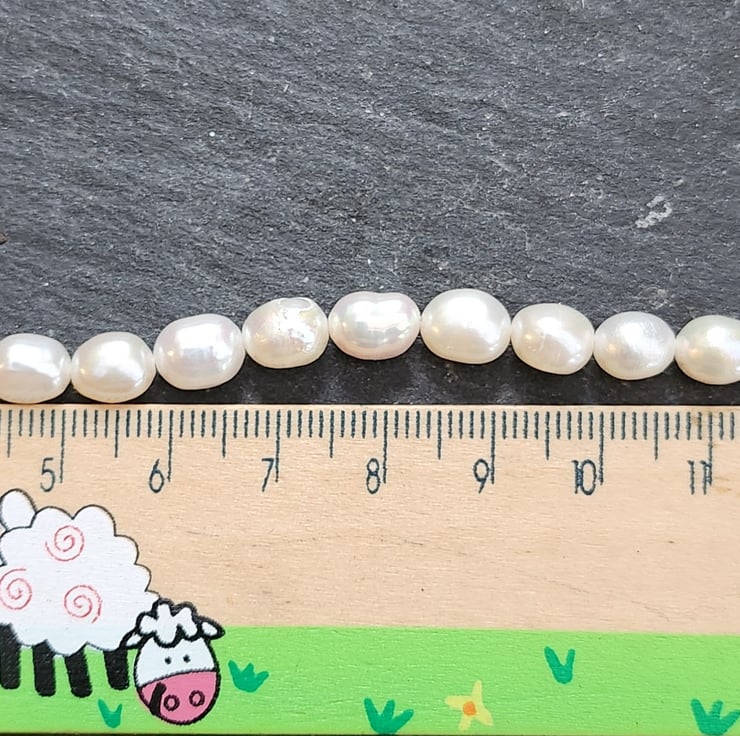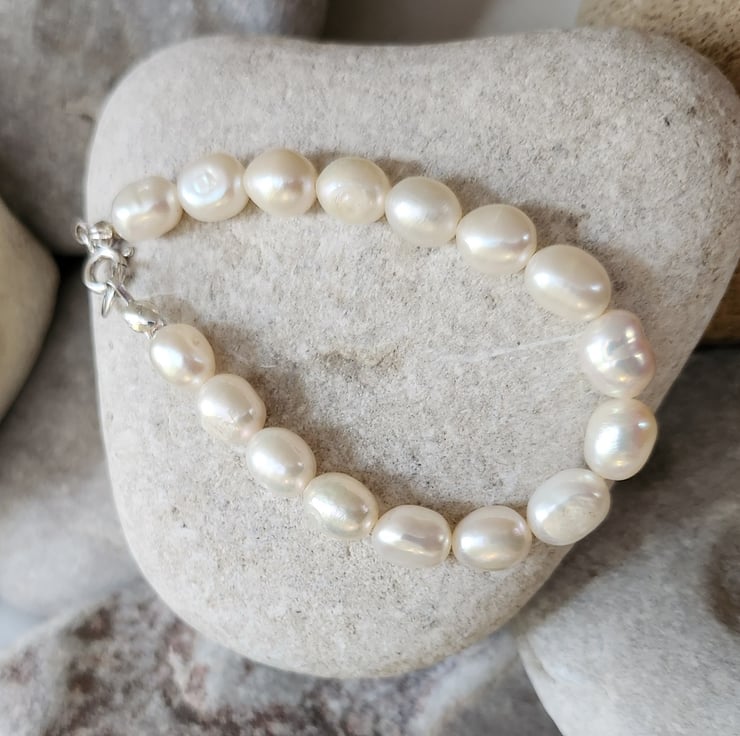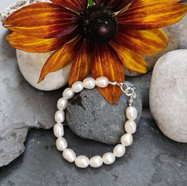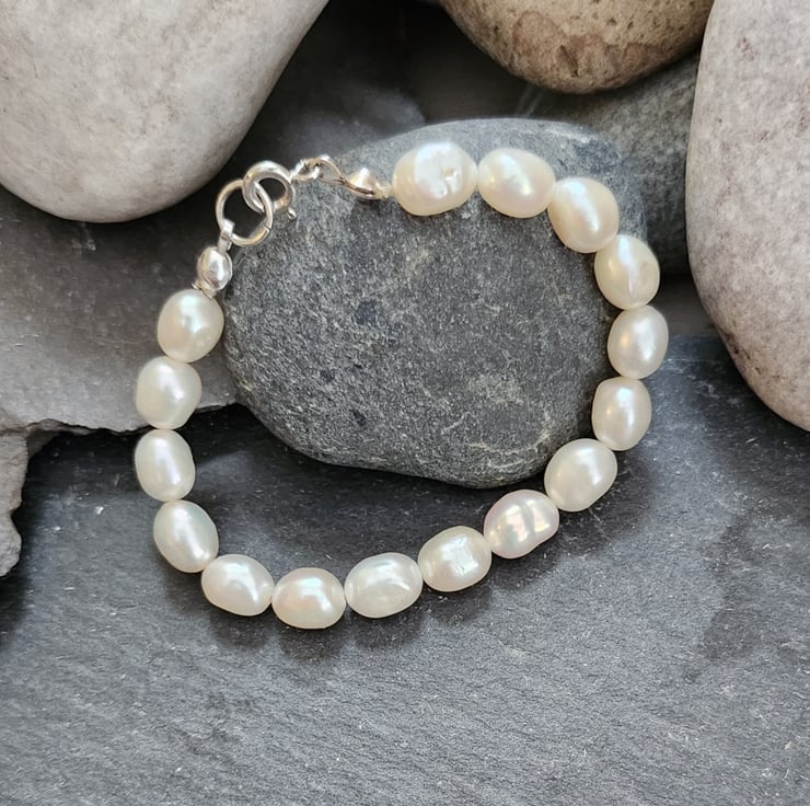 Delicate bracelet suitable for a child. Freshwater pearls, held together with double nylon thread for extra strength. Sterling silver connections and fastener findings. 15cms/6inches long.